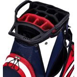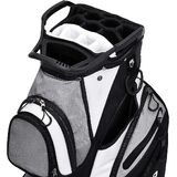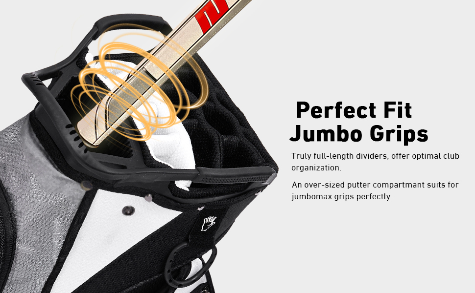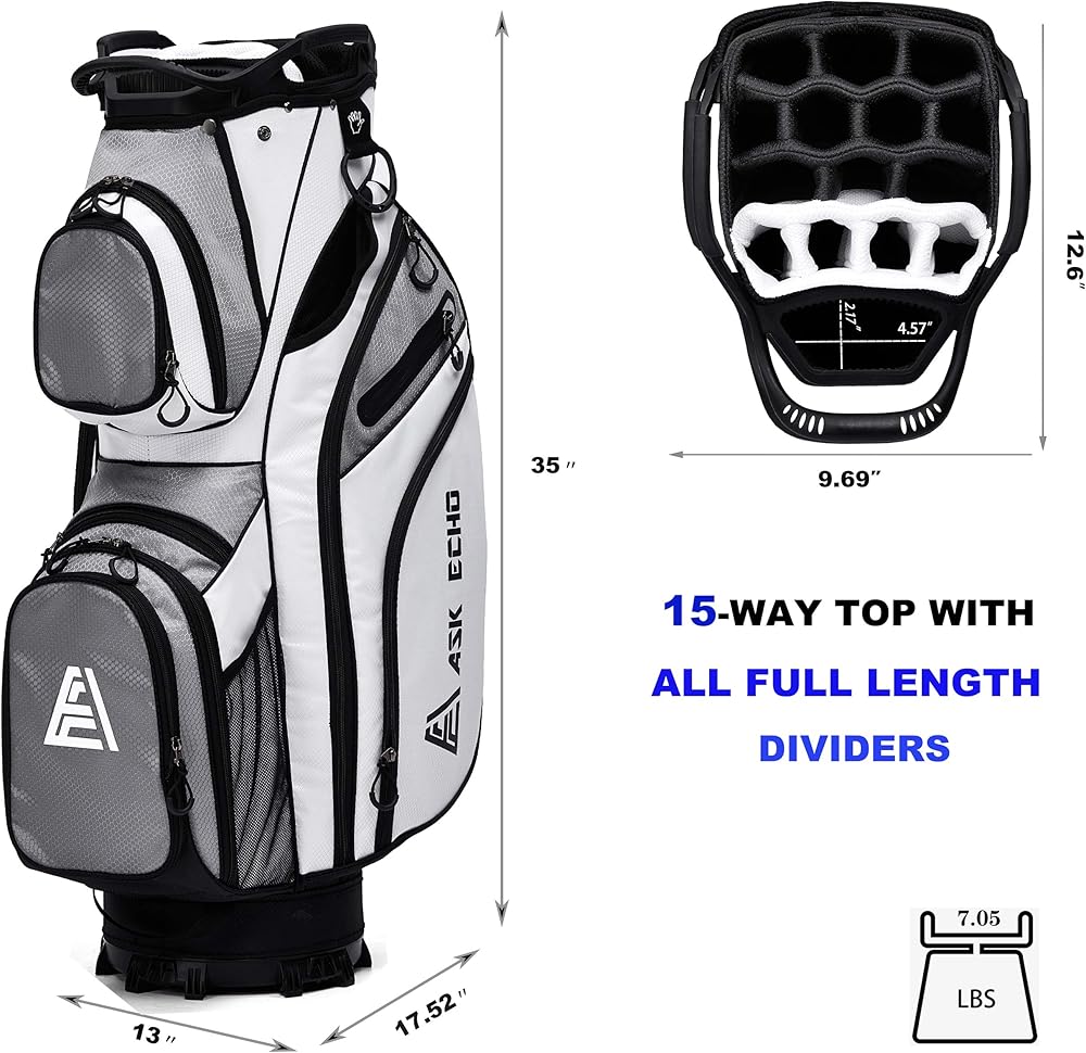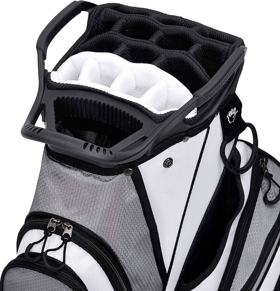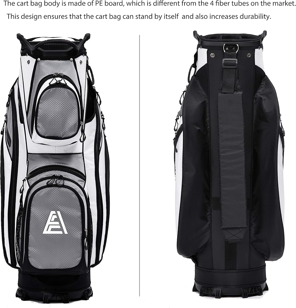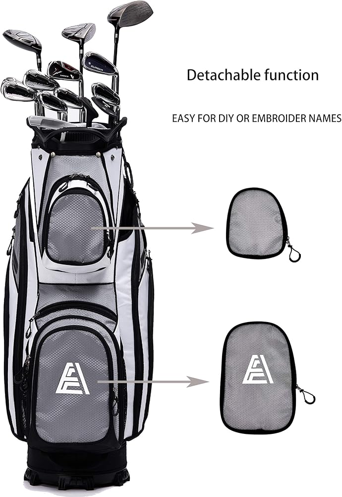 مساحة تخزين إضافية: 13 جيبًا - بما في ذلك جيبان في الأمام يمكن إزالتهما لإضفاء الطابع الشخصي على التطريز، و2 جيب كامل للملابس، وجيبين للأشياء الثمينة مبطنة بالقطيفة المقاومة للماء، وجيبين جانبيين إضافيين للأحذية، وجيبين شبكيين، وجيب كروي واحد. (يمكنها حمل 24 كرة جولف)، وجيب تبريد معزول مع مصارف (يمكن أن تحمل 8 زجاجات بسعة 12 أونصة)، وجيب واحد لمكتشف المدى. الكثير من الجيوب لجميع أدواتك وإكسسوارات الجولف
