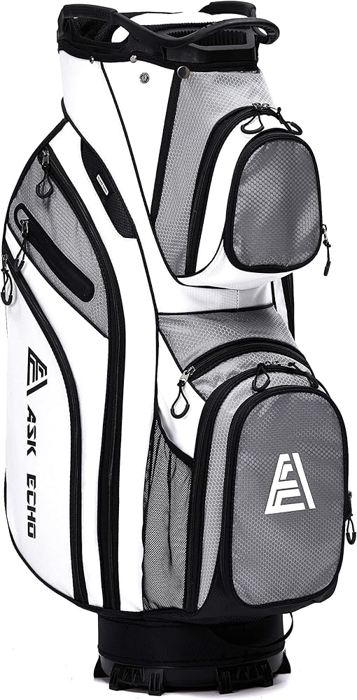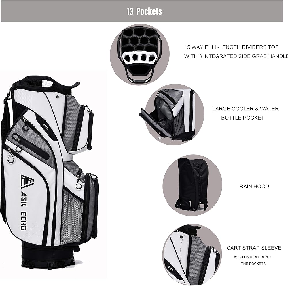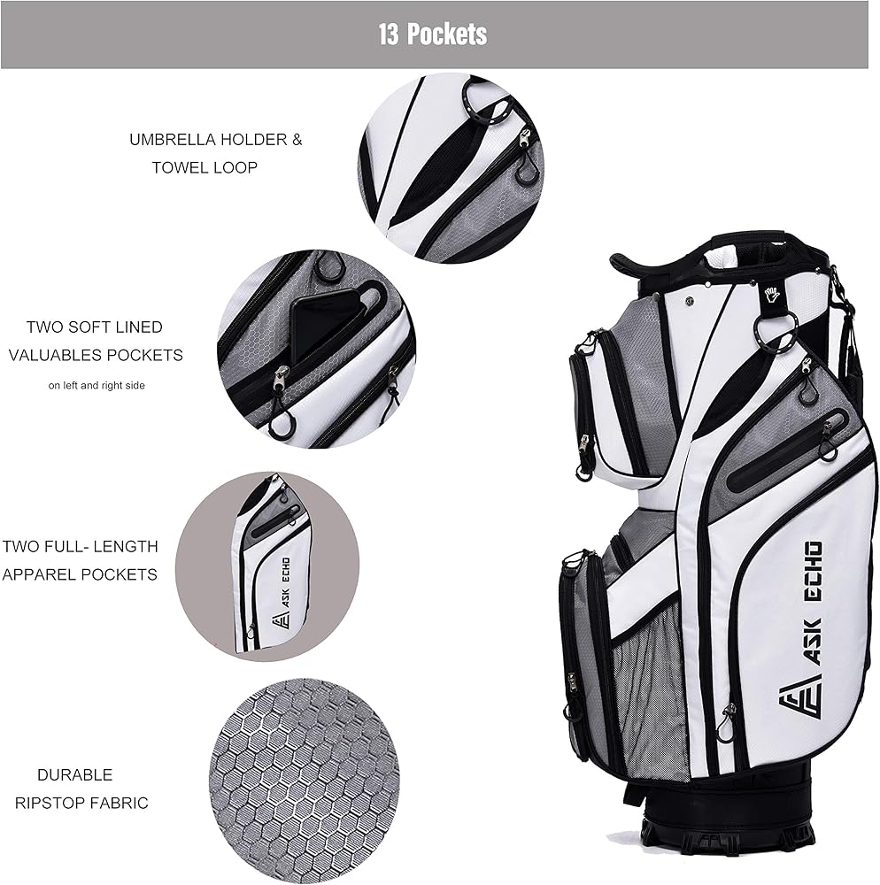 【المميزات】يتضمن غطاء المطر، وحامل قفازات فيلكرو، وحلقة منشفة الجولف، و3 مقابض جانبية مدمجة، وبطاقة الأداء وأكمام المظلة. تحتوي على مقبض خلفي وحزام كتف واحد مبطن. يتضمن ASK ECHO أيضًا قناة حزام لتأمين حقيبتك ونواديك في عربة التسوق الخاصة بك