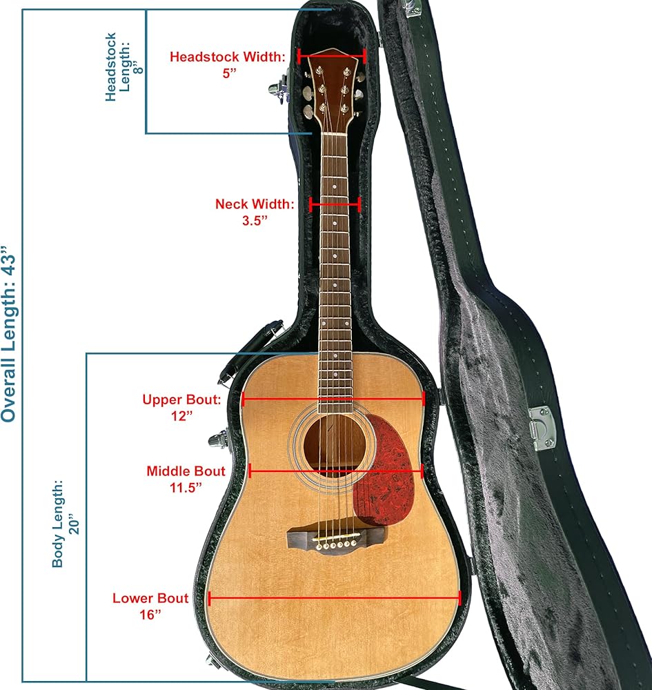 - يناسب العديد من الجيتارات الصوتية ذات 6 و12 خيطًا - انظر الأبعاد