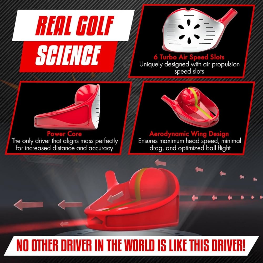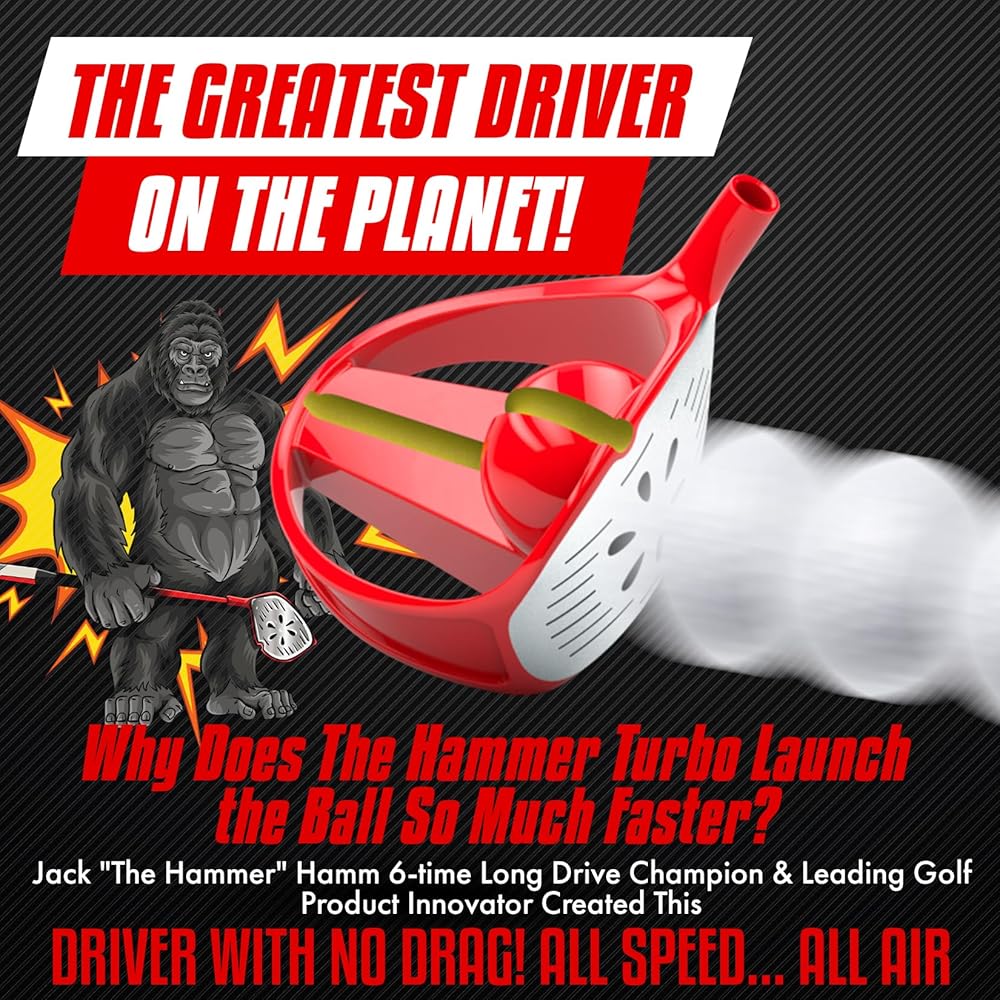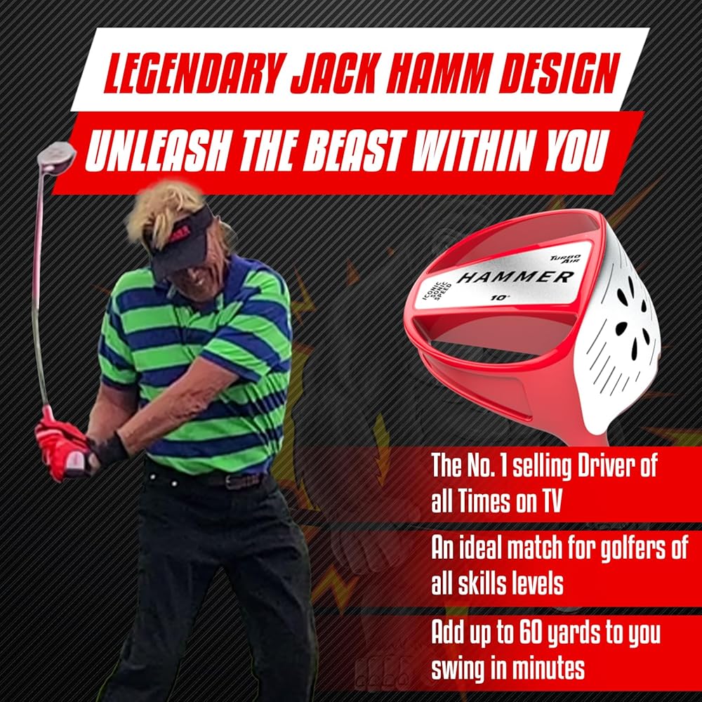 Step into the world of Jack Hamm, the legendary 6-time world champion known for his explosive drives, signature "BOOM", and iconic golf infomercials that have captivated audiences around the globe. With over a million golf clubs sold, Jack Hamm has revolutionized the game once again with his latest invention – The Hammer Turbo Air. Innovative Features: Six See-through Speed Holes: Just like Jack's lightning-fast swings, the Turbo Air features speed holes that allow air to smoothly flow through the club during your downswing, reducing drag and unleashing unparalleled clubhead speed. Exhaust Manifold: The air, guided by the speed slots, exits the club gracefully through the exhaust manifold, ensuring maximum efficiency in your drives. Powercore: Jack Hamm's genius lies in putting the club's mass exactly where it matters most, elevating your distance and power game to new heights. Flat Shaft: The Turbo Air's sleek, sword-shaped flat shaft cuts through the air like a champion's blade, delivering exceptional aerodynamics and enhanced swing control. Inverted Face Shape: Break away from tradition! The Turbo Air flips the script with its inverted face shape, offering golfers an expansive sweet spot that inspires confidence on every swing. Breaking the Mold: While major OEMs like Taylormade, Callaway, and Titleist release similar products each year, the Hammer Turbo Air dares to challenge the status quo. It's a golf driver that brings about changes and innovations never before attempted by industry giants. Join the revolution, experience the power, and feel the excitement of the Hammer Turbo Air Golf Driver – the game-changer that's making golfers worldwide yell "BOOM" and "BAM" on every tee shot.