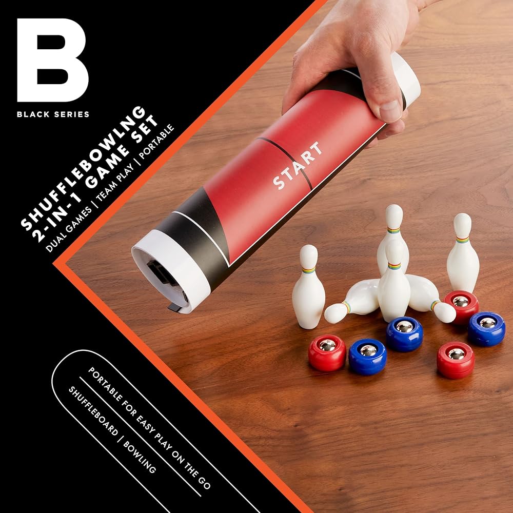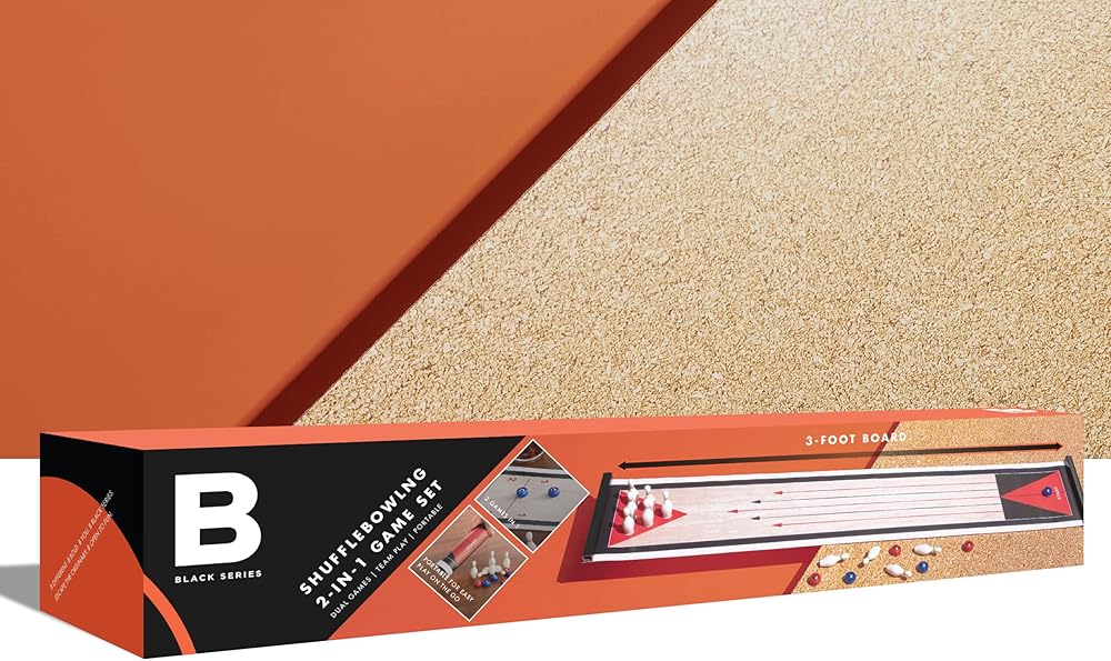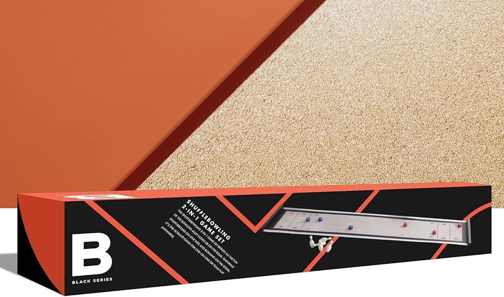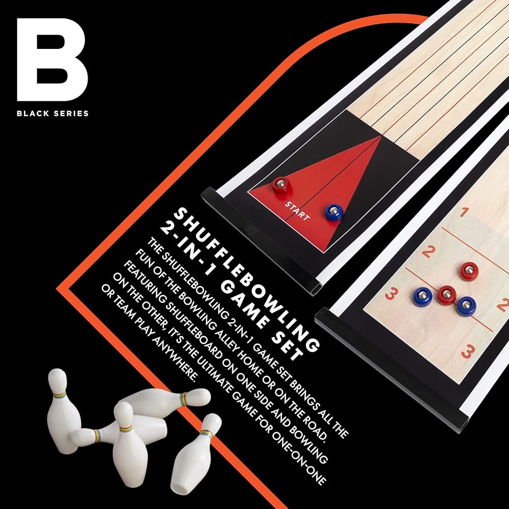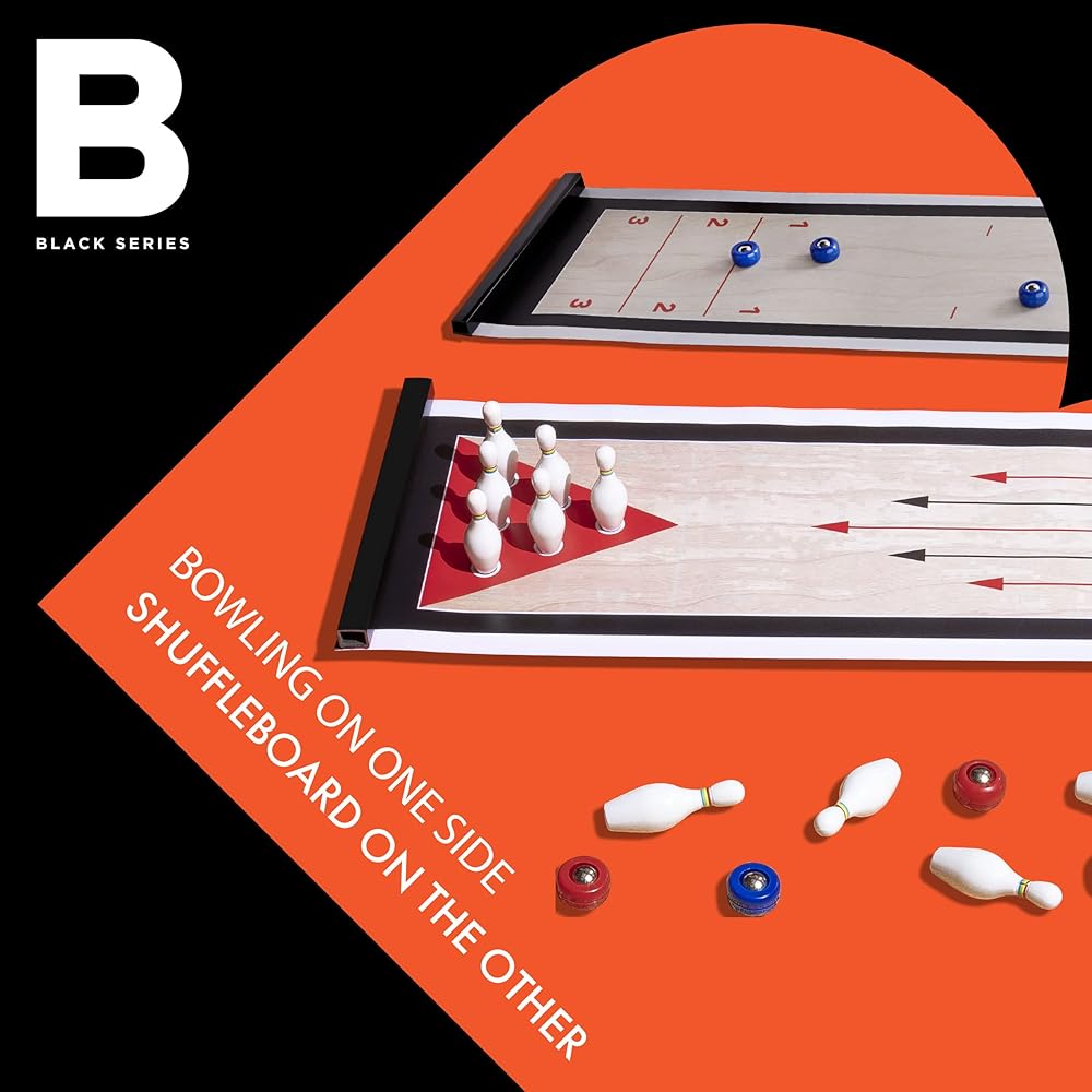 ✔ما هو متضمن: تأتي المجموعة مع بساط لعب مزدوج الجوانب بالإضافة إلى 6 كرات بولينج/ كرات شوفلبورد و10 دبابيس بولينج.
