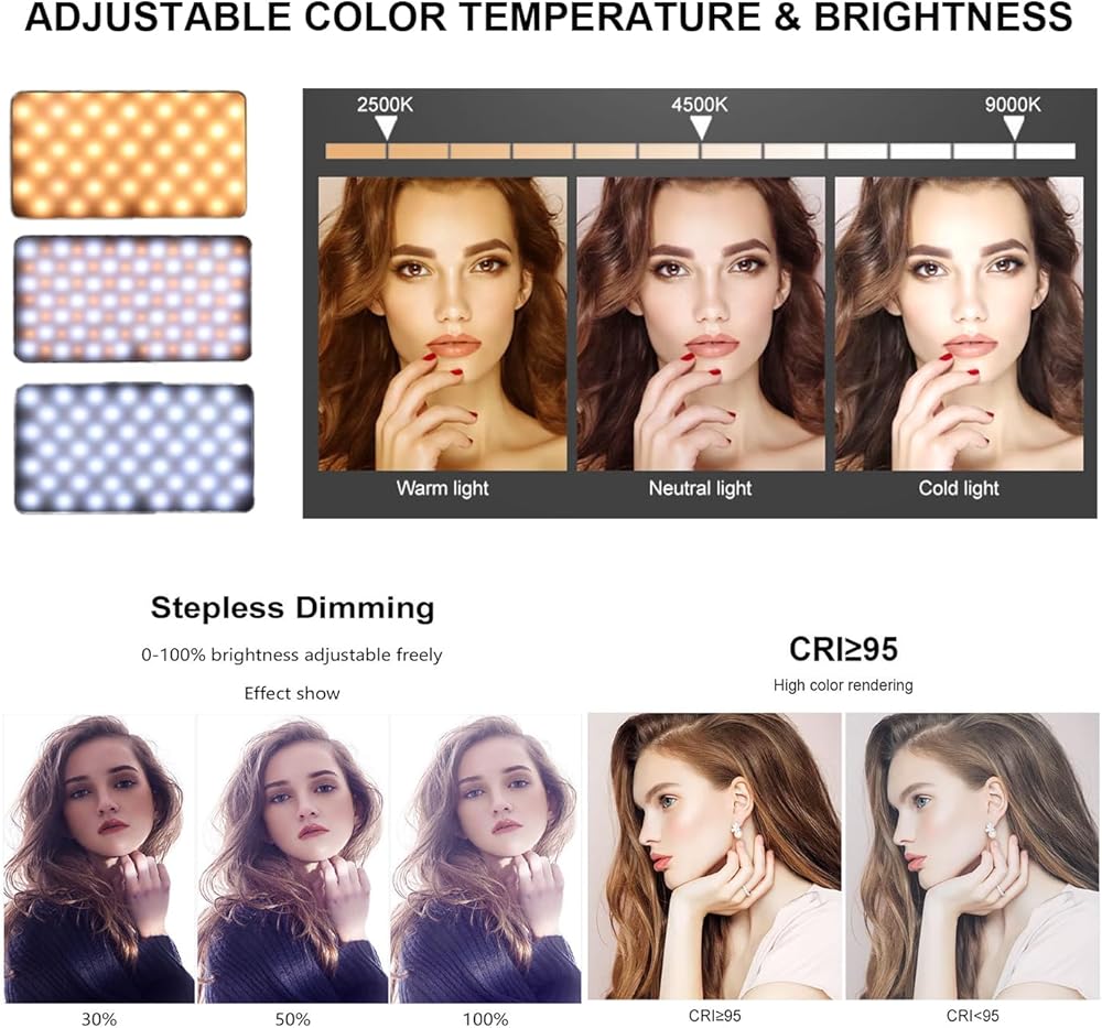 • 【3 أوضاع إضاءة 】يحتوي مصباح السيلفي المشبك هذا على 3 أوضاع إضاءة (أصفر دافئ + أبيض دافئ + أبيض بارد)، تعديل درجة حرارة اللون 2500K-9000K، ضبط درجة حرارة اللون دون عناء للحصول على الجو المرغوب فيه بلا عيوب.