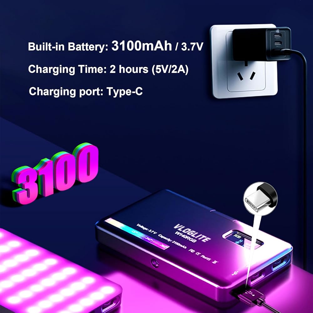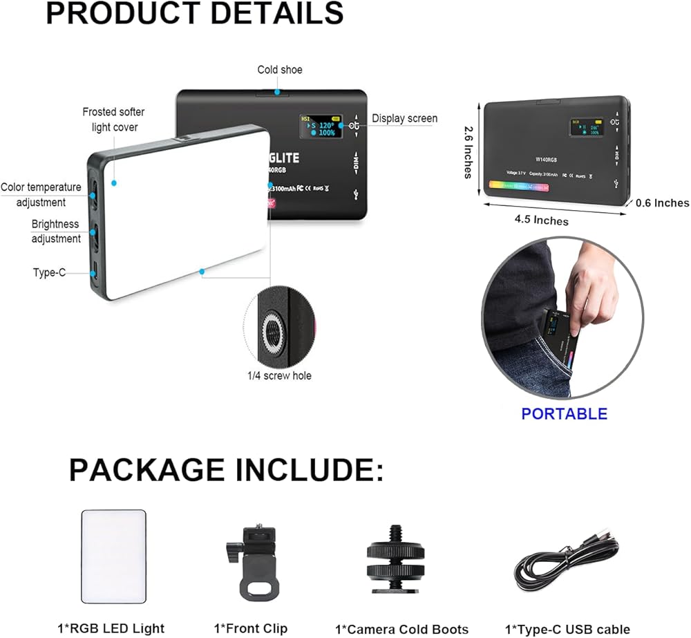 • 【مصباح تعبئة محمول قابل لإعادة الشحن】مصباح الهاتف القابل لإعادة الشحن هذا بحجم الجيب، مريح للحمل. مجهزة ببطارية قابلة لإعادة الشحن بقوة 3100 مللي أمبير في الساعة، توفر ما يصل إلى ساعتين من التشغيل بأقصى سطوع، ويمكنك تشغيلها من جهاز كمبيوتر محمول أو باور بانك