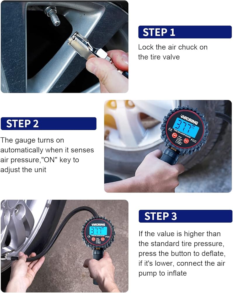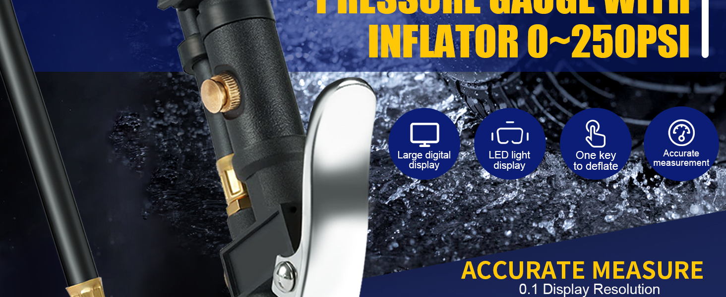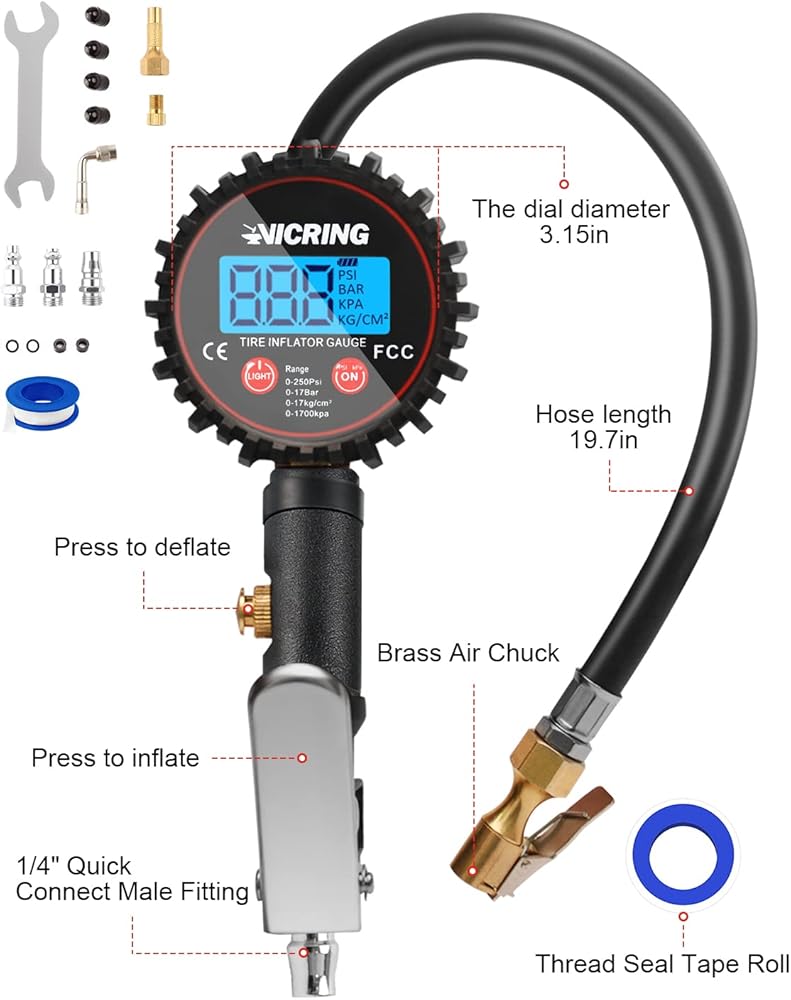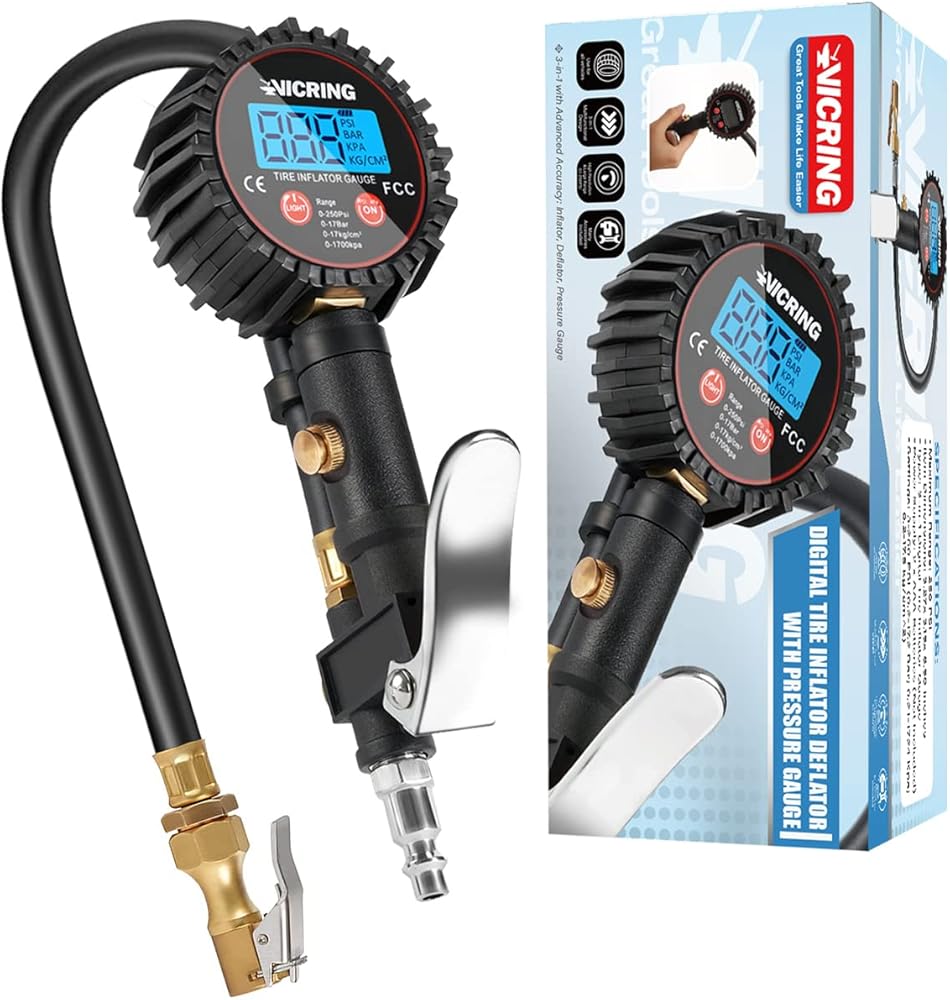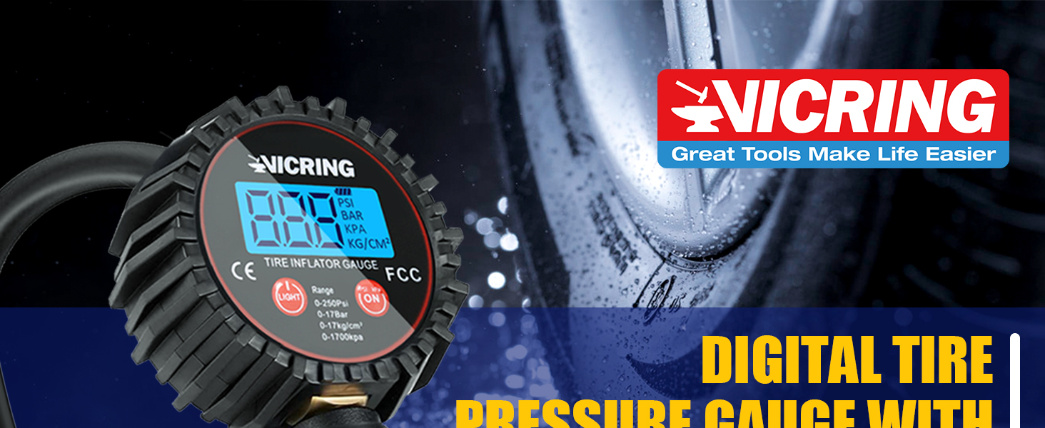 【سهل ومنتج】مقياس ضغط الهواء فيكرينغ مع وظيفة التفريغ والنفخ وفحص ضغط الإطارات. لا داعي للذهاب ذهابًا وإيابًا مع ظرف الهواء ومقياس الهواء، كما أن الشاشة الرقمية الكبيرة المزودة بالضوء تجعل من السهل قراءتها.
