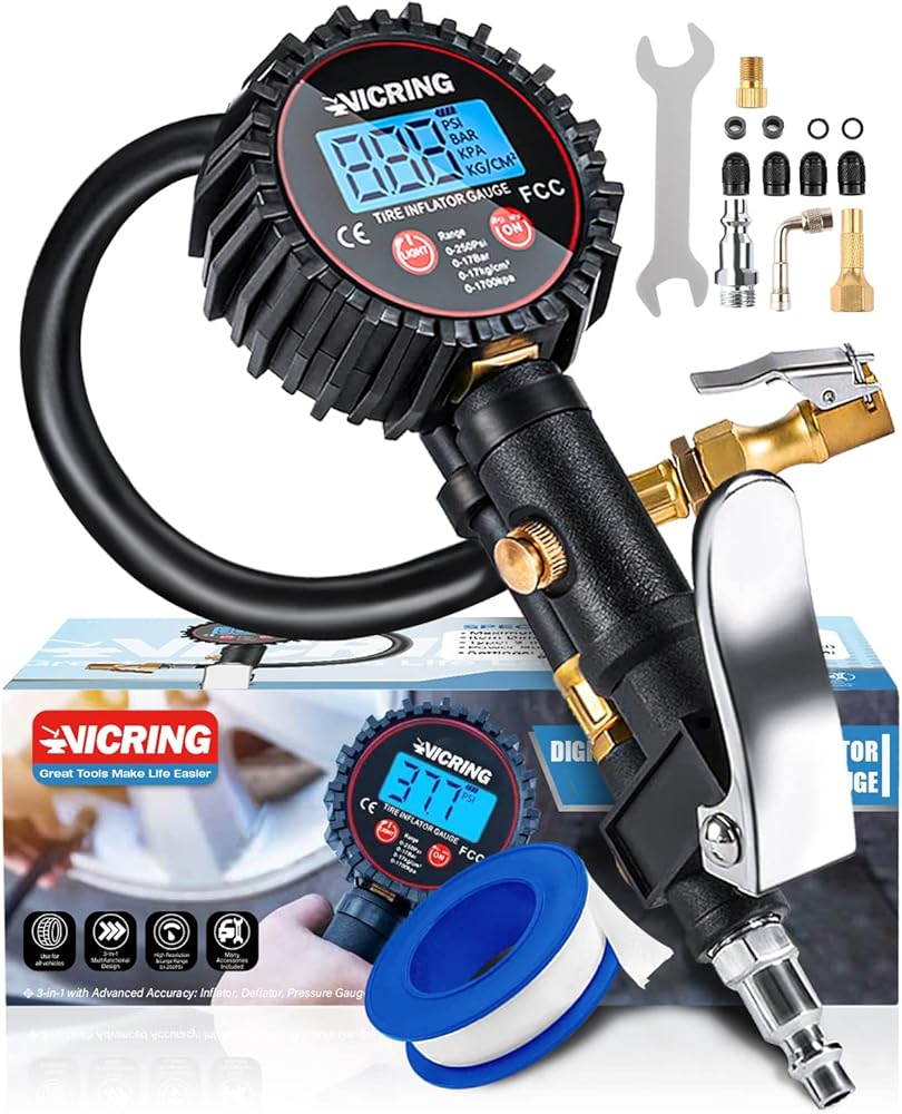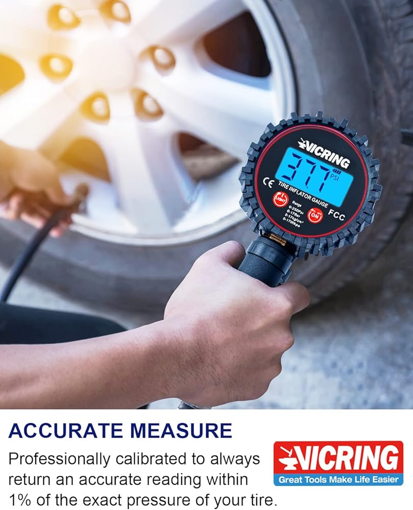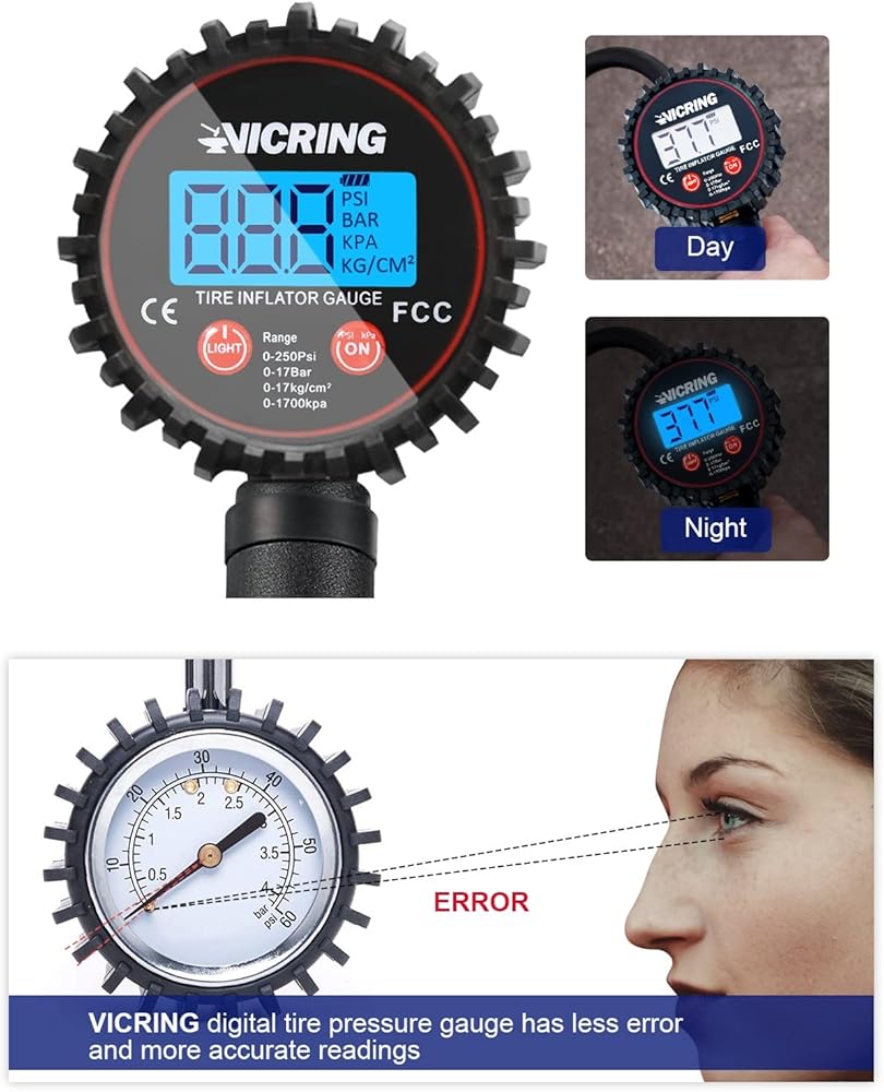 【قياس دقيق للغاية】مقياس ضغط الإطارات من VICRING مع منفاخ للتحقق بدقة من نطاق الضغط من 0-250 رطل لكل بوصة مربعة، وتمت معايرته باحترافية لإرجاع قراءة دقيقة دائمًا في حدود 1% من الضغط الدقيق لإطارك.