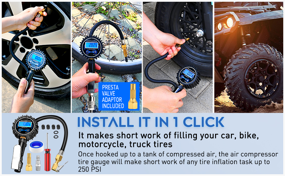 • SUPERIOR CONSTRUCTION: Built of heavy duty steel and brass components that provide lasting performance; Use for all vehicles, such as car, suv, truck, motorcycle, bicycle (with Schrader valve) etc.