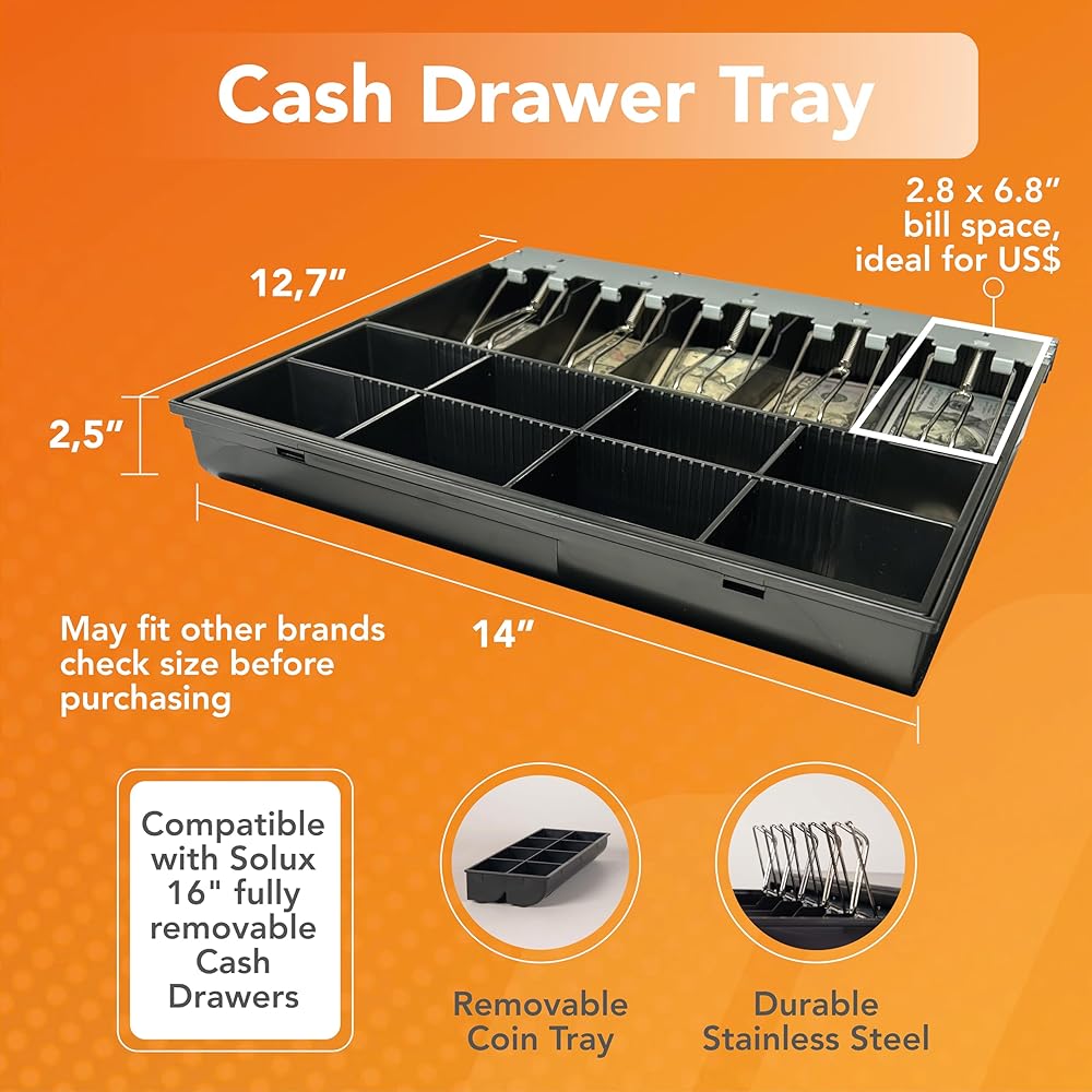 💰 أقصى قدر من الكفاءة ارفع مستوى التعامل مع أموالك من خلال صينية درج النقود مقاس 14 × 12.7 × 2.5 بوصة - صينية إدخال درج تسجيل النقد المُحسّنة المصممة لسجلات النقد SOLUX مقاس 16 بوصة. تأكد من إجراء معاملات سريعة باستخدام صينية من الفولاذ المقاوم للصدأ قابلة للإزالة بالكامل
