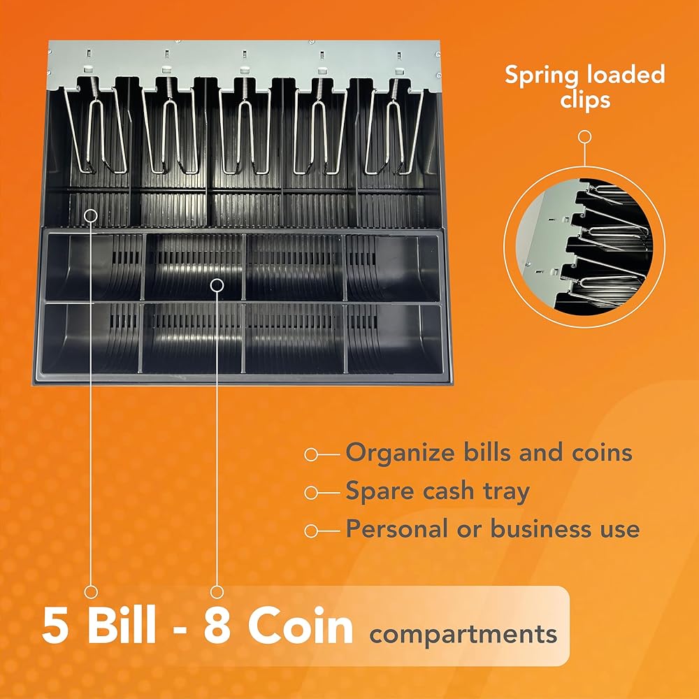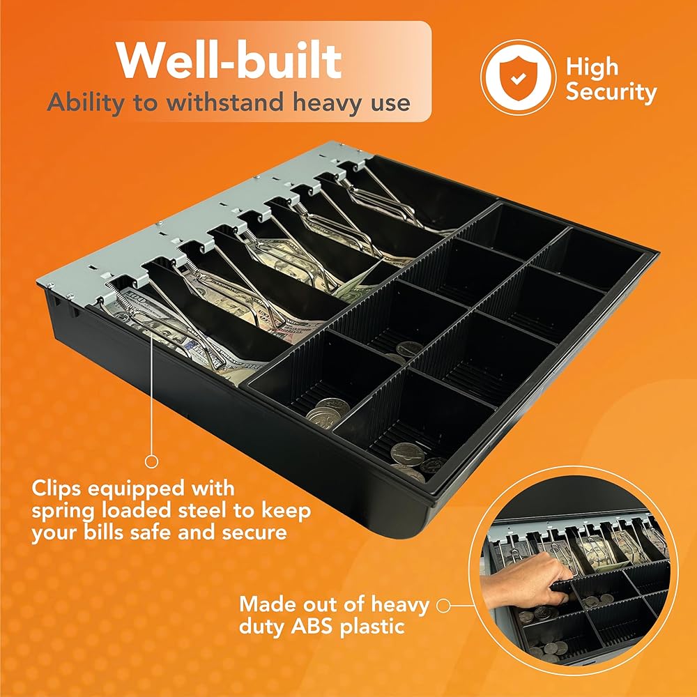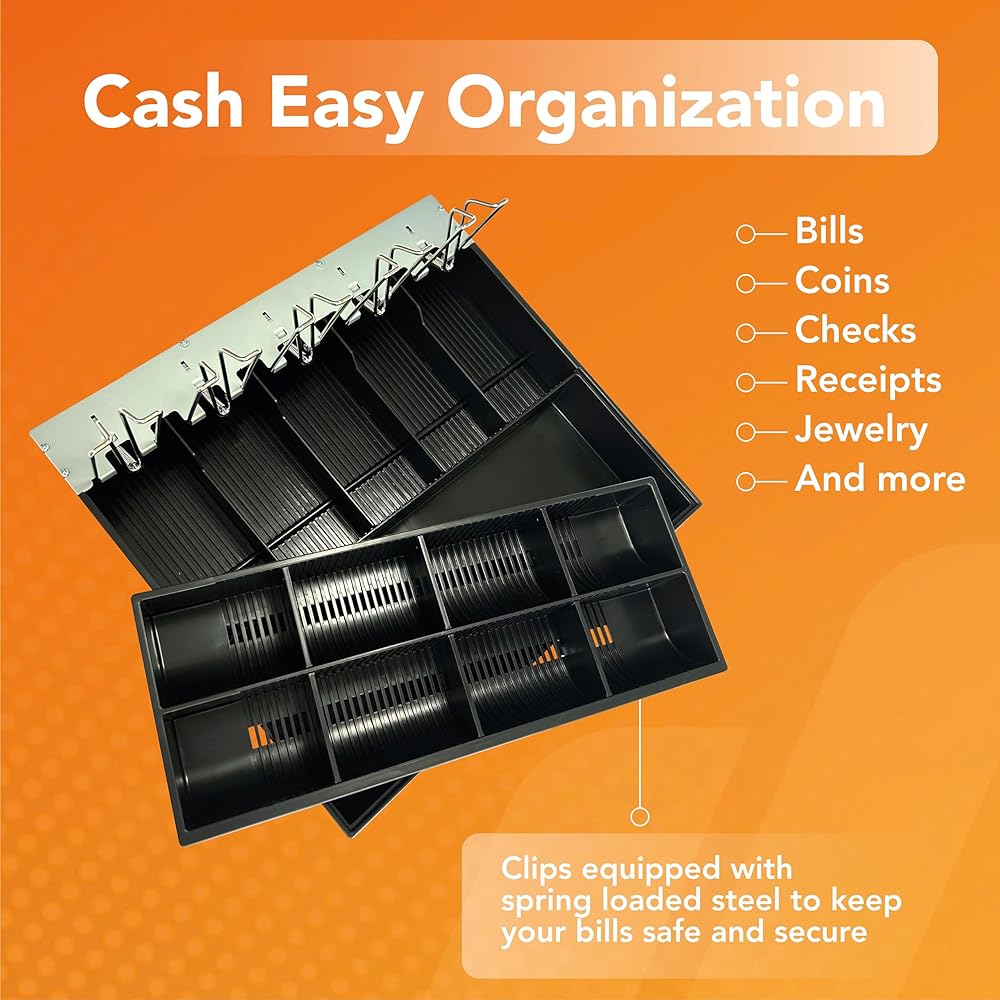 💵 التنظيم الأمثل: استمتع بتجربة المعاملات السلسة مع منظم درج النقود الخاص بنا للفواتير. تُعد درج النقود البديلة المكون من 5 فواتير/8 عملات معدنية الحل الأمثل لدرج النقود. ارفع مستوى ماكينة تسجيل النقد الخاصة بك باستخدام صينية تنظيم النقود المتينة والفعالة