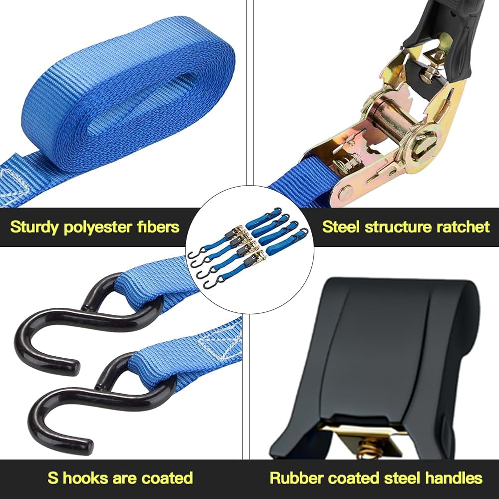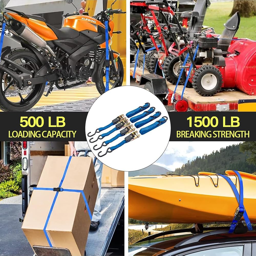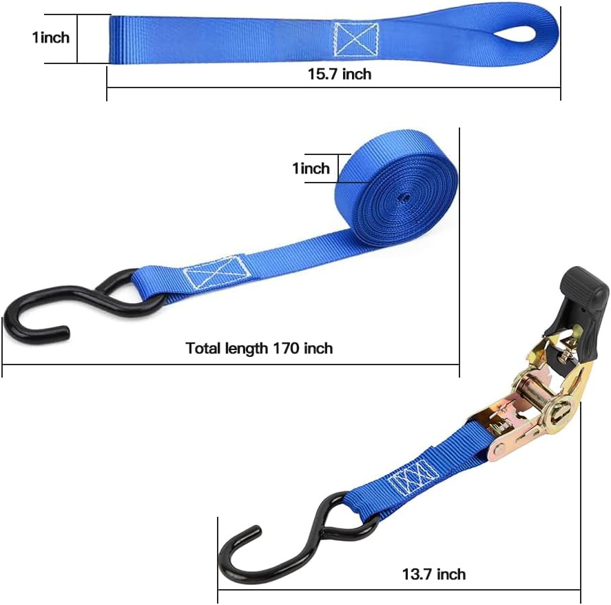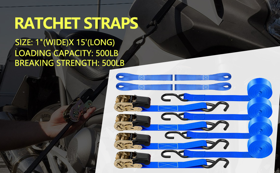 أشرطة ربط السقاطة: أشرطة الربط هي 1 بوصة (عرض) × 15 بوصة (طول). تتضمن العبوة: 4 × أبازيم سقاطة معدنية متينة مع 8 خطافات S مطلية للخدمة الشاقة، 4 × حلقات ناعمة إضافية. تصميم عالي التحمل يسمح 15 قدم لتحمل حمل عمل يصل إلى 500 رطل مع حد كسر 1500 رطل للمركبات ذات الأحجام المختلفة لتأمين الدراجات النارية والدراجات والمركبات الرباعية والملحقات والبضائع على الأمتعة والمقطورات وأسرّة الشاحنات الصغيرة في ظروف الطقس الخارجية المختلفة.