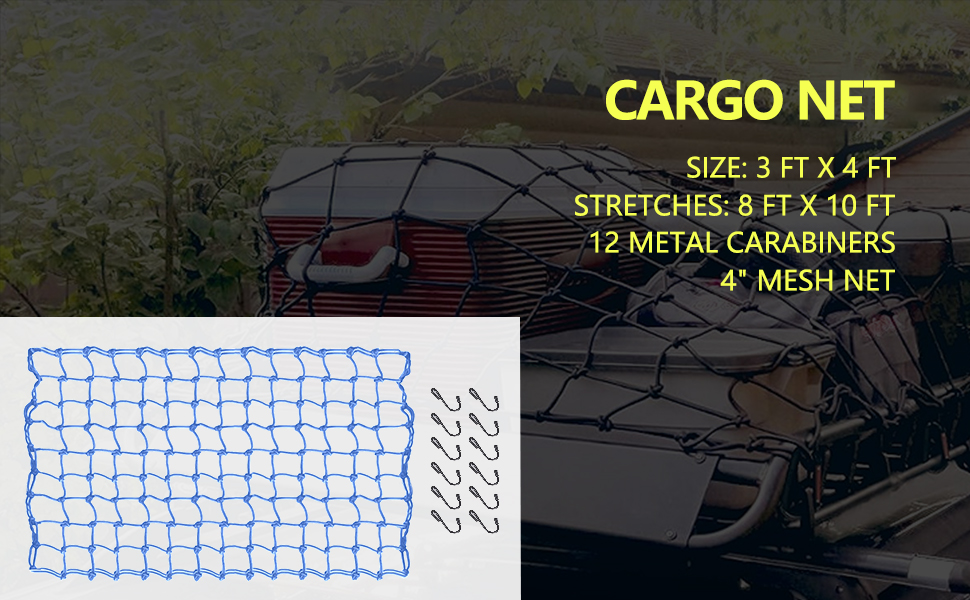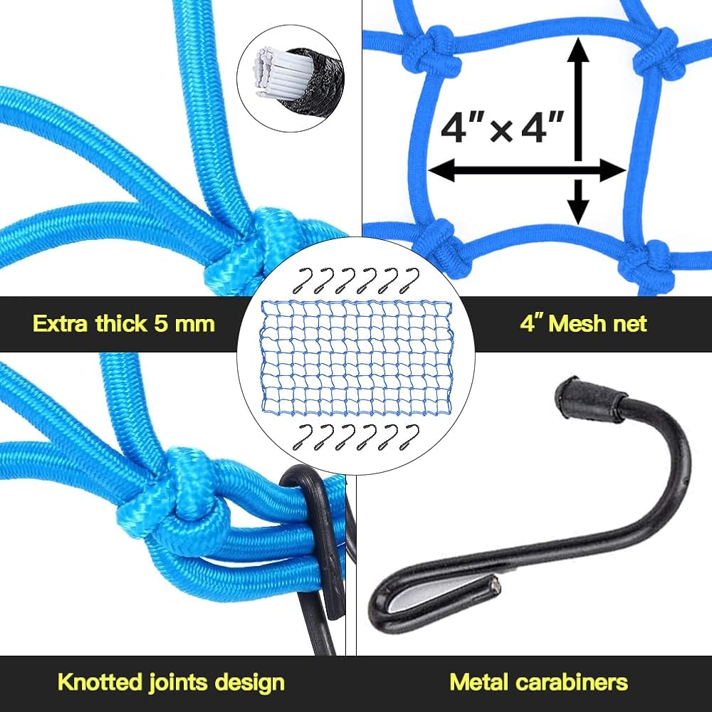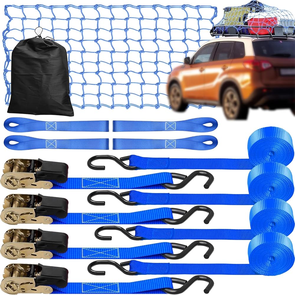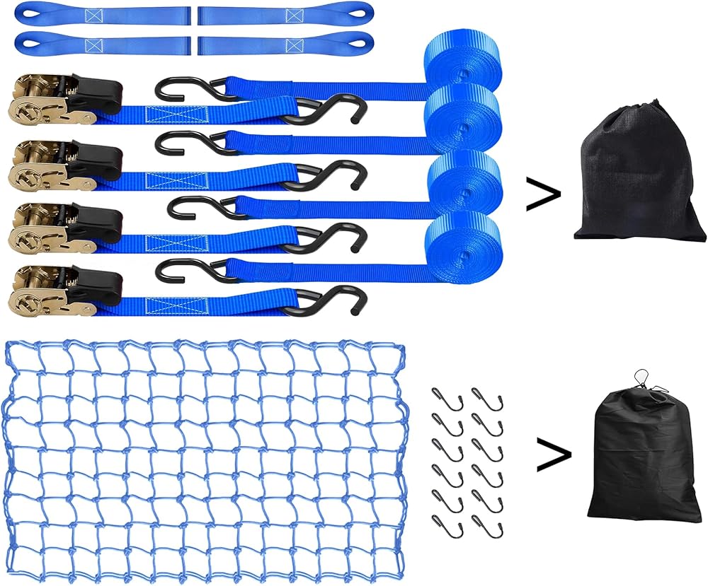 نظام ثابت كامل: أنشأنا مجموعتنا الكاملة من وسائل النقل/السفر بهدف تلبية مجموعة متنوعة من الاحتياجات. أحزمة ربط السقاطة الخاصة بنا آمنة يمكن الاعتماد عليها لنقل مجموعة متنوعة من الأشياء الصغيرة والكبيرة بما في ذلك الدراجات النارية أو الزورق أو الكاياك أو ATV أو الصناديق أو القوارب أو الأثاث أو معدات العشب أو المقطورة أو رف السقف. شبكة شحن مصممة بمربعات شبكية ضيقة مقاس 4 × 4 بوصة تمنع العناصر الصغيرة من السقوط وتوفر المزيد من القوة لحماية عناصر البضائع الأكبر حجمًا أثناء الركوب.