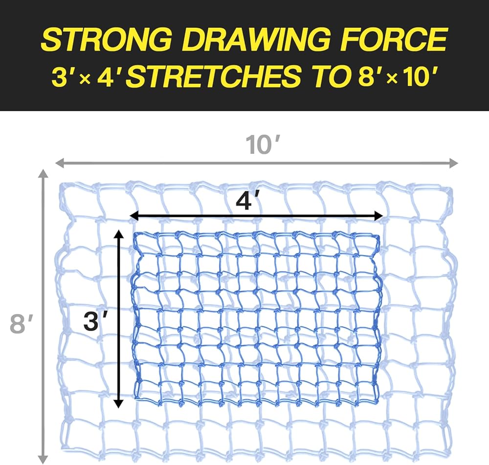 إيقاف حركة الشحن: إنه مثالي لحاملات البضائع على السطح ورفوف الأمتعة للالتقاط والشاحنات والمقطورات وسيارات الجيب وجي إم سي وسيارات الدفع الرباعي وATV/UTV والقوارب وما إلى ذلك. مصممة بشبكة شبكية ضيقة مقاس 10.16 سم × 10.16 سم، تمنع شبكة سرير الشاحنة العناصر الصغيرة من السقوط وتوفر المزيد من القوة والحماية.