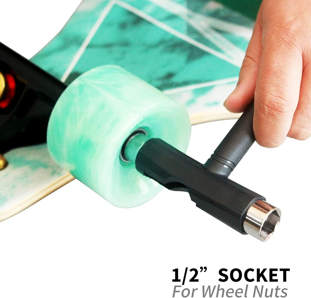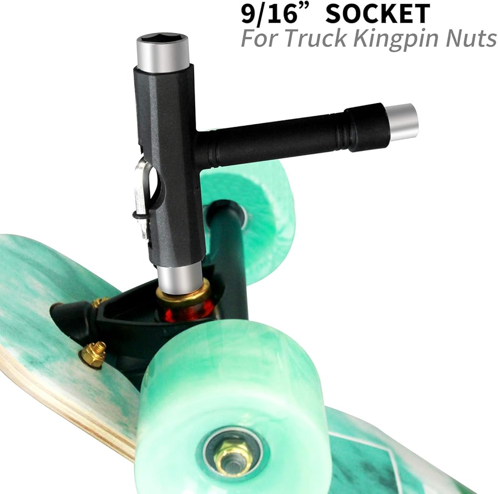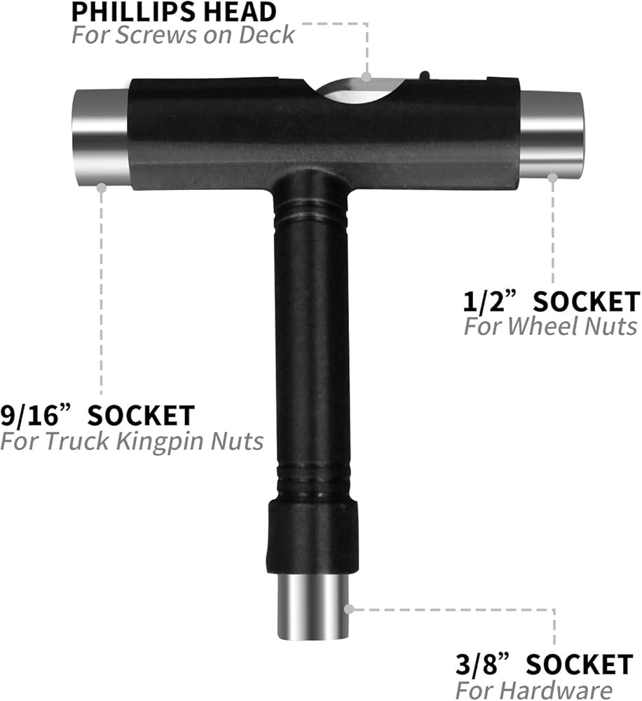 - للوح: تعمل هذه الأداة على شكل حرف T مع جميع أنواع ألواح التزلج والألواح الطويلة، ويمكن أن تساعد في تغيير العجلات وتنظيف محملك