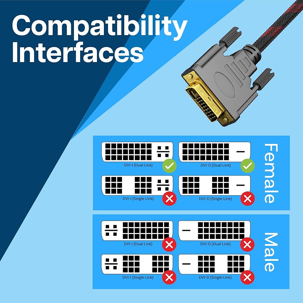 This bidirectional Male DVI-D to Male DVI-D cable converter is compatible with various Female DVI-equipped output devices, including graphics cards in laptops or desktops. The DVI port cable can also connect to HDTVs, displays, monitors, or projectors with Female DVI-D Dual Link and DVI-I Dual Link ports.