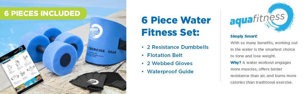 معدات التمارين المائية: مجموعة مكونة من ست قطع للتمرين منخفض التأثير؛ يتضمن حزام سباحة للبالغين لخصر 20-60 بوصة مع حزام وإبزيم قابلين للتعديل، دمبل، وقفازات مقاومة، ودليل