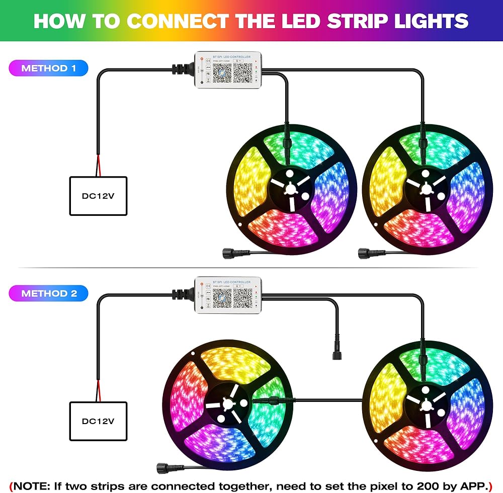 • ❗❗❗ إذا كنت بحاجة إلى تمديد طول الضوء، فأنت بحاجة إلى ضبط البكسل في التطبيق، وتكون بكسل شريط الضوء 1 متر هي 20. البكسل الافتراضي هو 100، وإذا أضفت شريطًا بطول 5 أمتار، فستحتاج إلى زيادة 100 ، وهو 200 بكسل. على سبيل المثال، إذا تم توصيل شريطين معًا، فستحتاج إلى ضبط البكسل على 200.