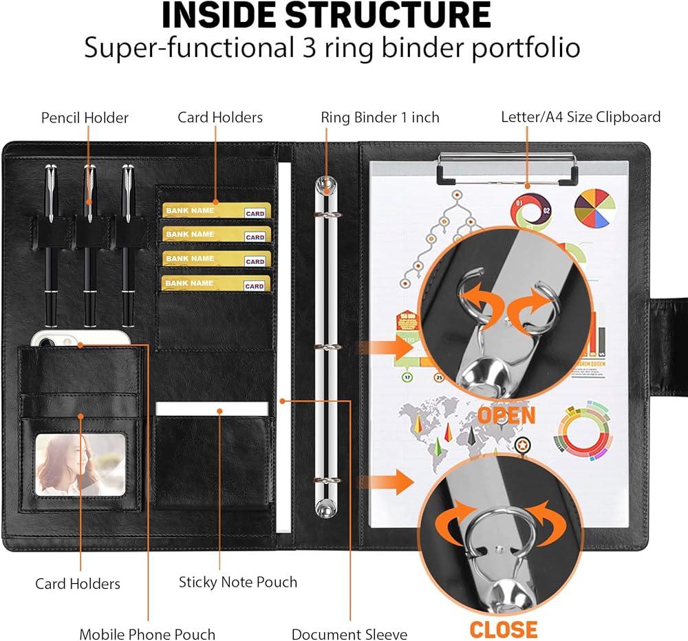 [حافظ على التنظيم] - تحتوي محفظة الأعمال Toplive A4 على 4 حاملات بطاقات، وجيب إيصالات واحد، وغطاء مستندات واحد، وحامل أقلام واحد، و3 حافظة حلقات (1 بوصة). استمر في تنظيم مستنداتك أو أوراقك أثناء المقابلة أو المؤتمر أو العرض التقديمي.