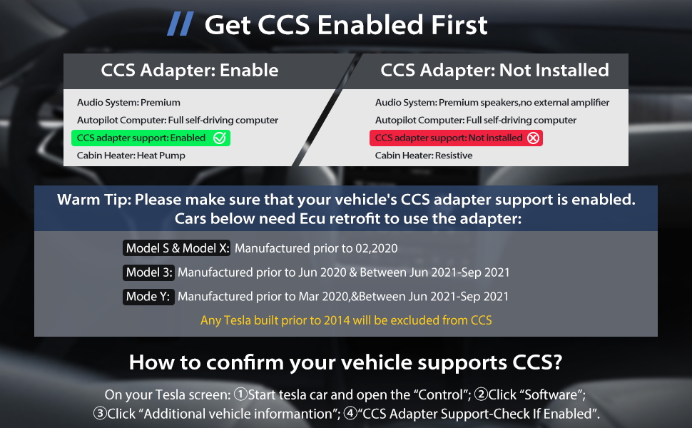 • 1. نصائح تنبيه: فقط تذكر وضع المحول على الكابل أولاً، ثم قم بتوصيله بسيارتك. إذا قمت بتوصيله بالسيارة أولاً، فلن ينجح هذا. بالنسبة لسيارات Tesla التي تدعم CCS فقط، يرجى ترقية تمكين CCS قبل استخدام هذا المحول. ستتطلب أي سيارة Tesla تم تصنيعها قبل أكتوبر 2020 تحديث وحدة التحكم الإلكترونية لتمكين CCS. نموذج بدون وظيفة CCS1، يرجى الانتقال إلى Tesla لإجراء تحديث وحدة التحكم الإلكترونية.