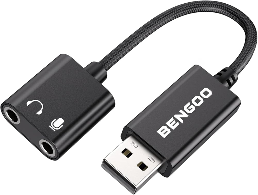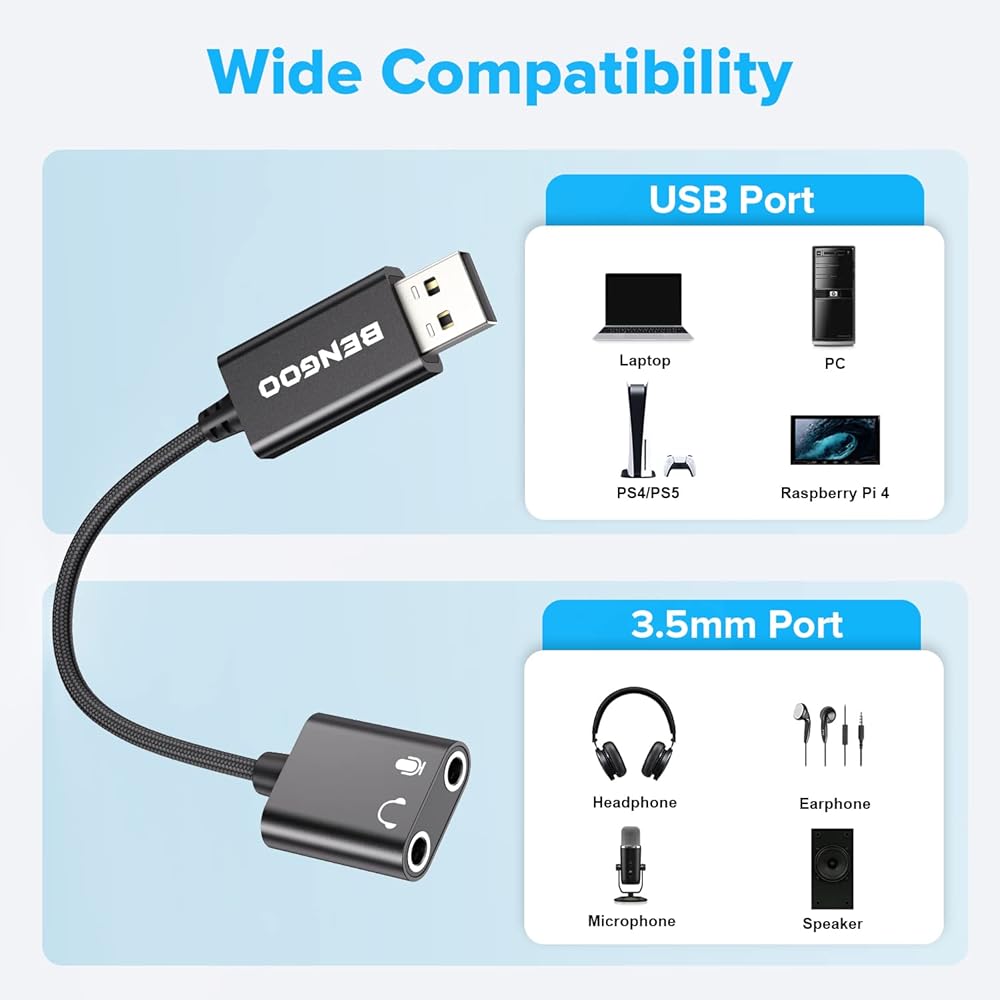 محول بطاقة صوت USB من BENGOO، محول صوت USB 3.5 مم جاك، بطاقة صوت خارجية مع سماعة رأس TRS مزدوجة ومقبس ميكروفون لأجهزة الكمبيوتر المحمول التي تعمل بنظام التشغيل Windows Mac Linux وأجهزة الكمبيوتر المكتبية وسماعات PS4، أسود