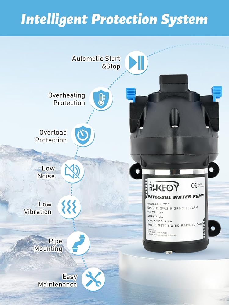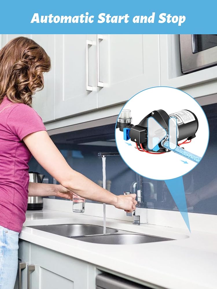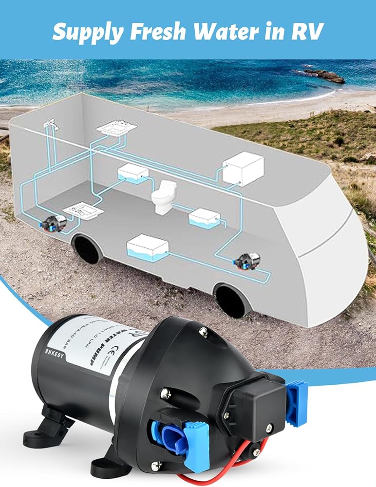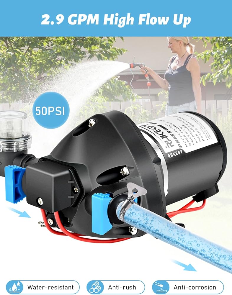 This professional RV water pump has an automatic start-stop function with a pressure switch, a built-in bypass switch, a reflux function, low power consumption, high performance, low noise, flexible installation, 360-degree installation without dead corners, convenient installation, convenient disassembly, low noise, and stable operation.