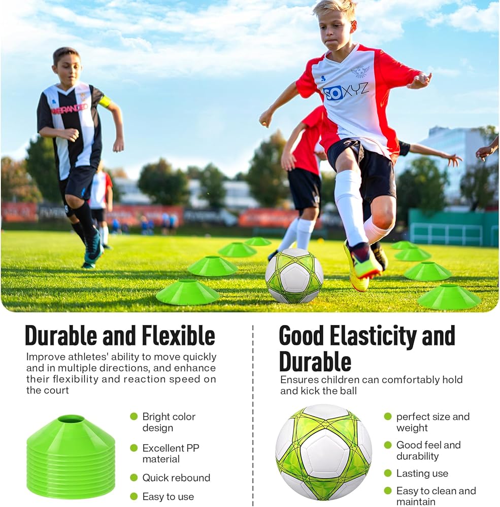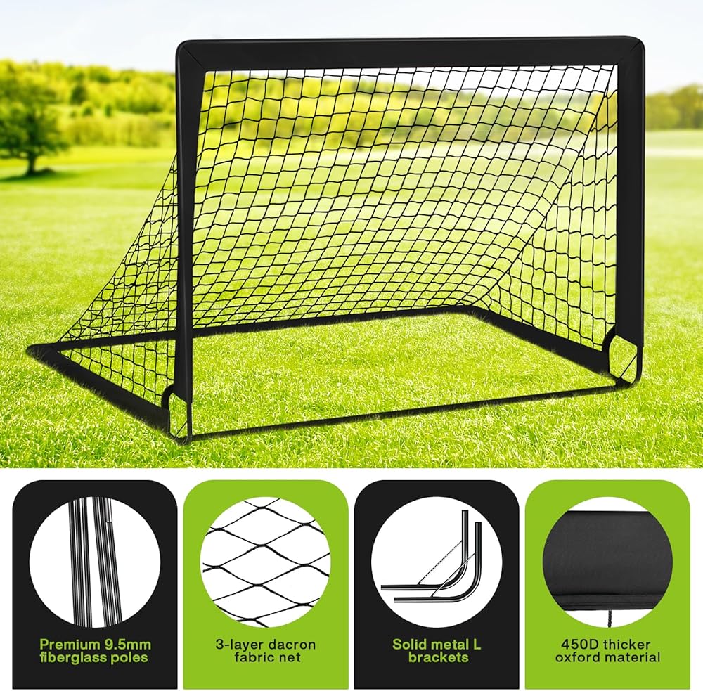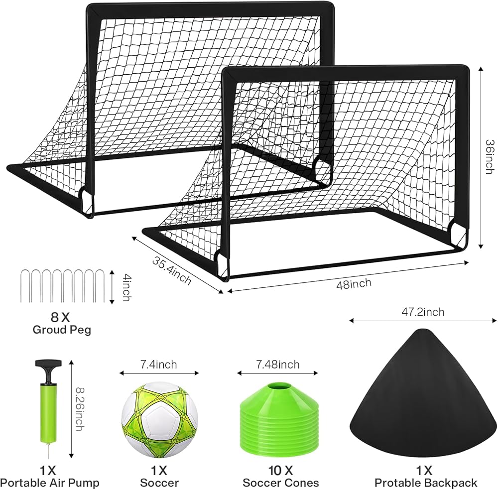 Practical & Valuable Soccer Goals Set: This is a complete soccer goals for backyard, perfect for your backyard skill practice. Includes 2 sets of 4x3ft portable soccer net, 1 standard 3-size football,1 air pump, 10 cones, 8 U-shaped heavy-duty ground spikes, and 1 carrying bag.