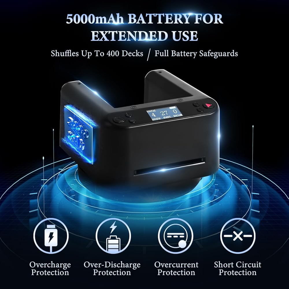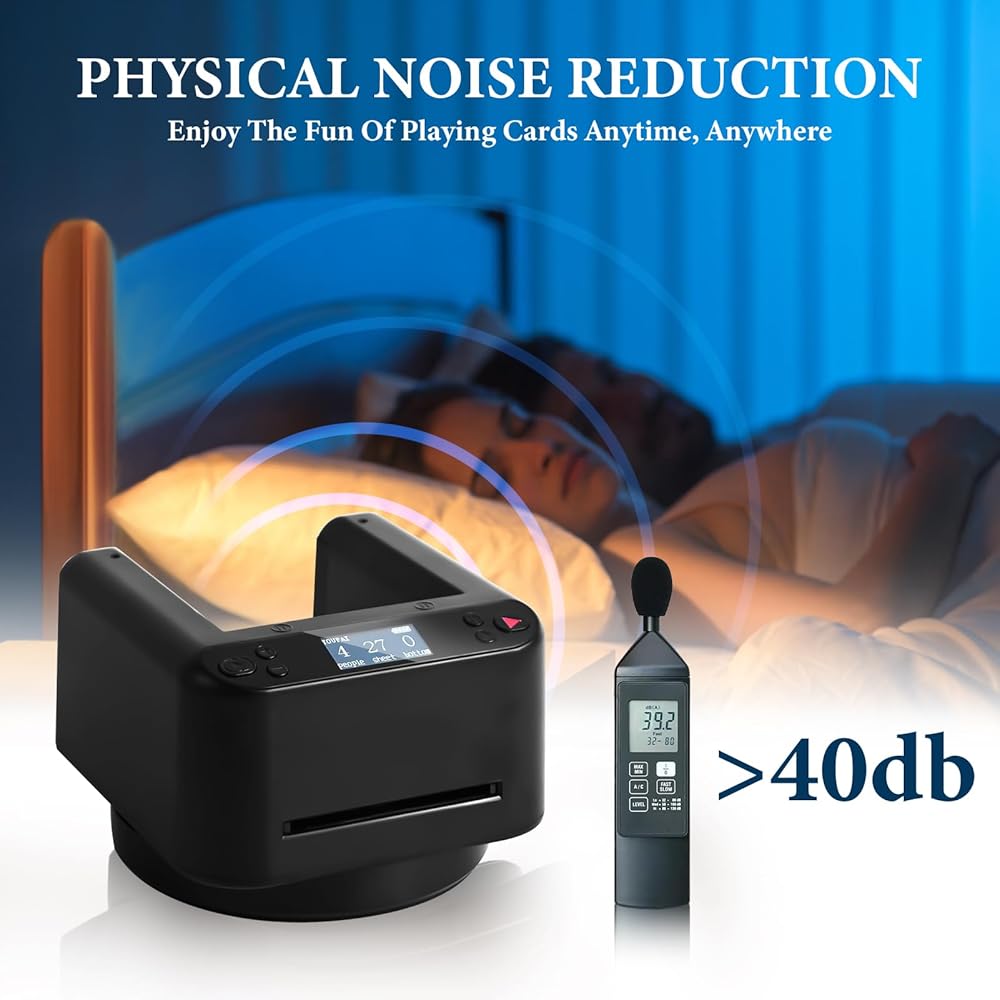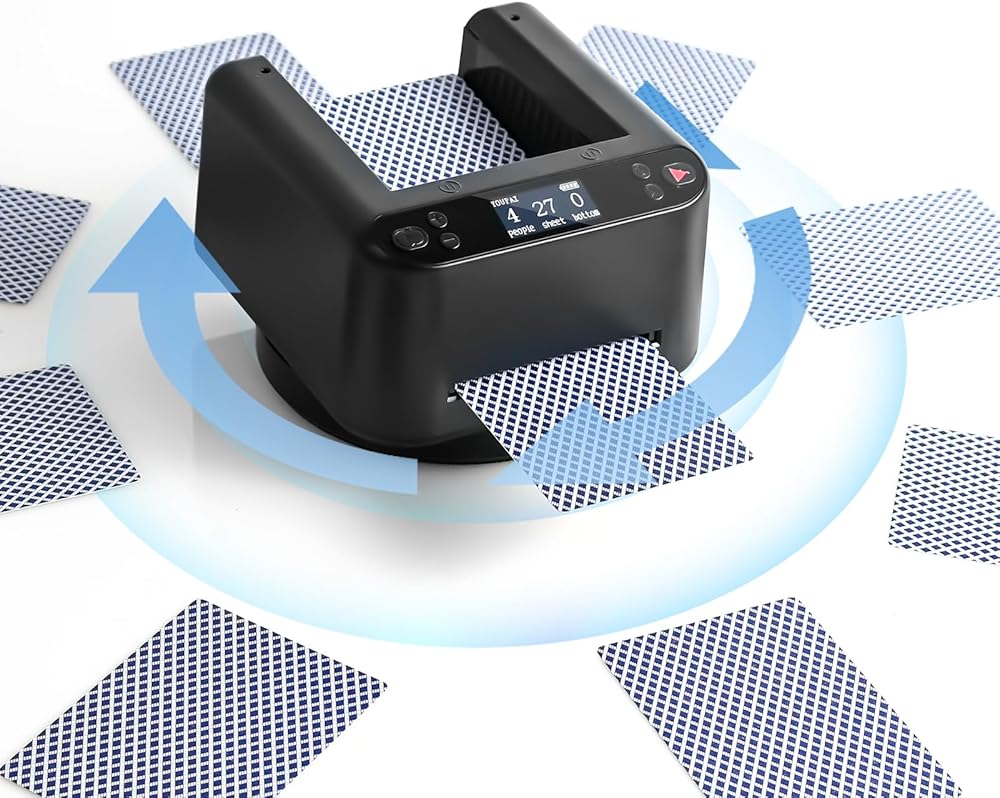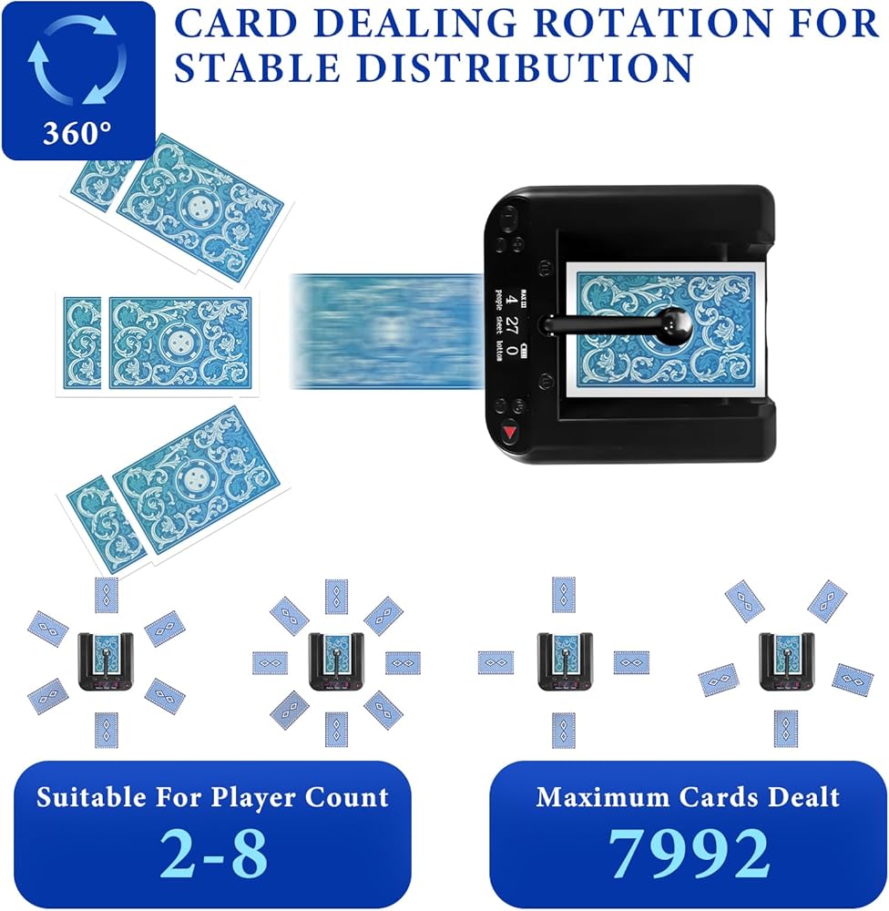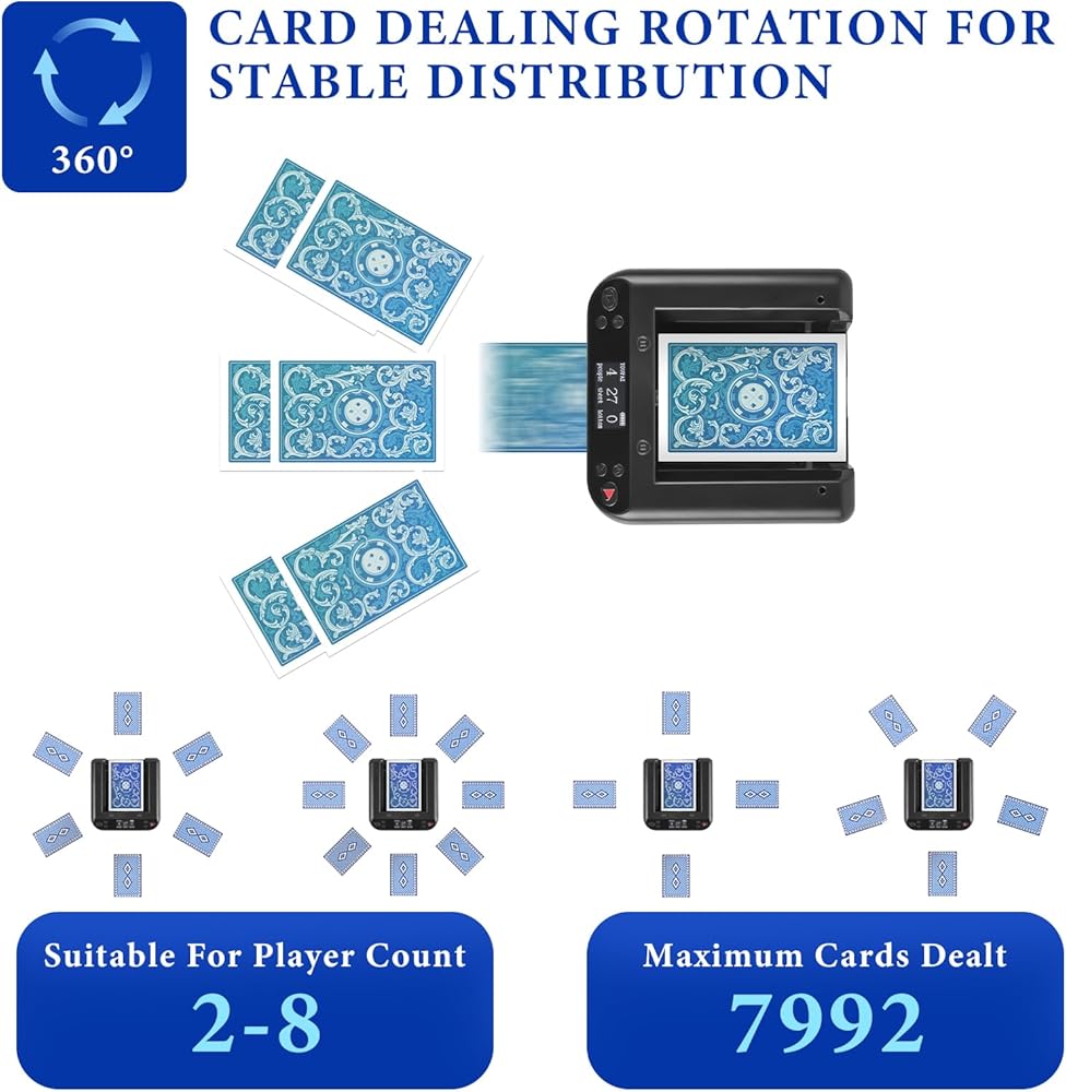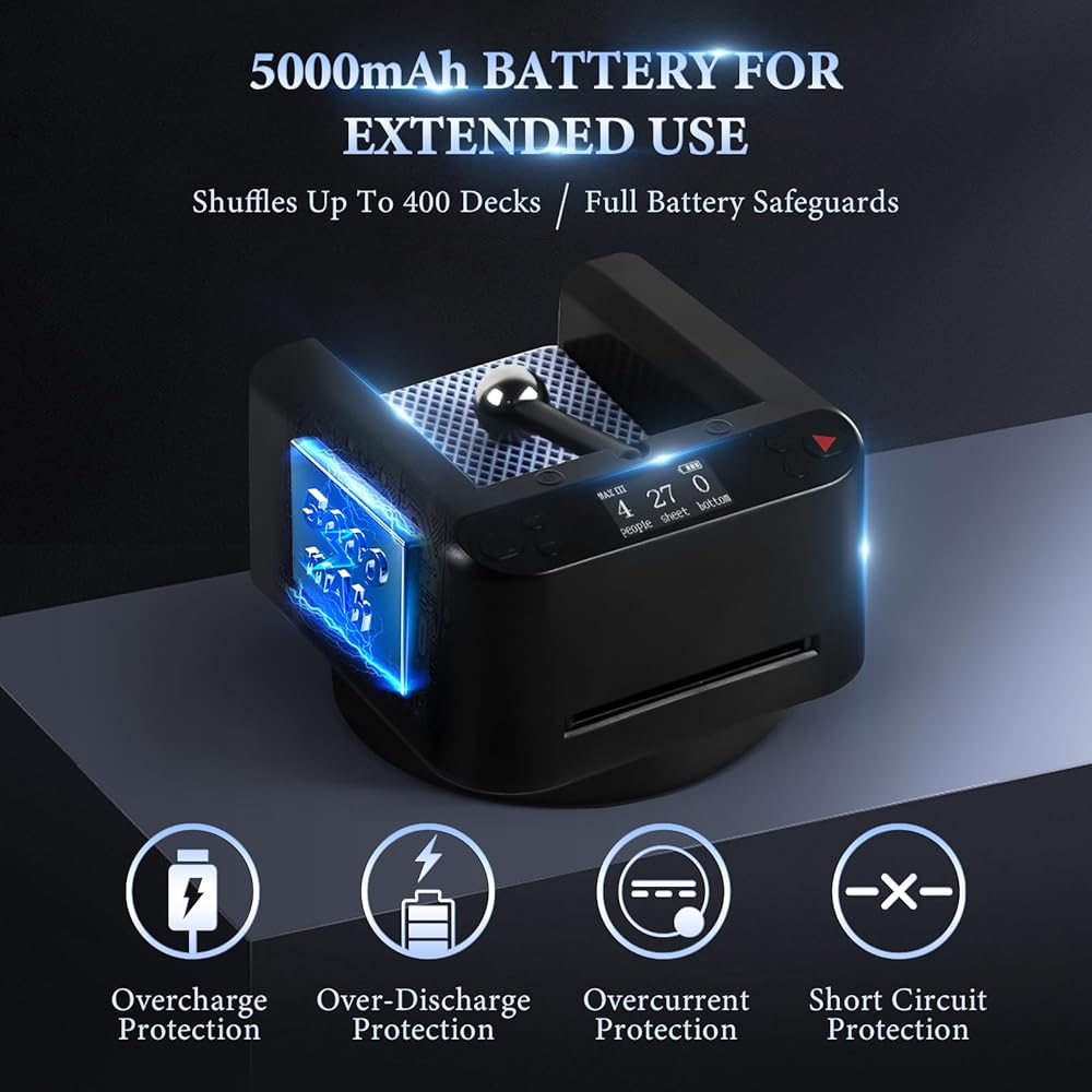 【Automatic Smart Card Dealer】With a 5000mAh battery, enjoy 3-7 days on a single charge. The oversized, shock-absorbing, non-slip base and low-noise dual motors ensure stable and quiet card dealing.