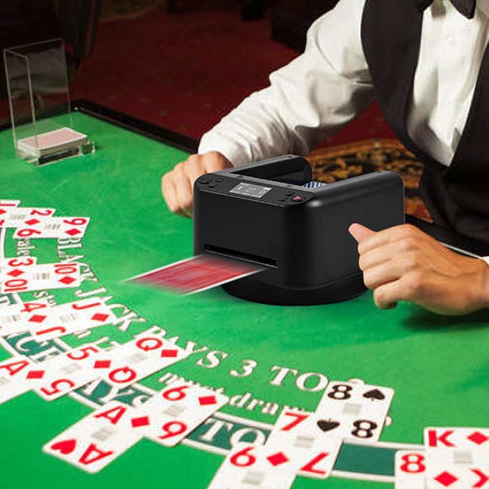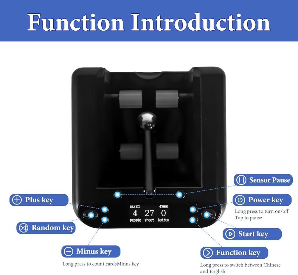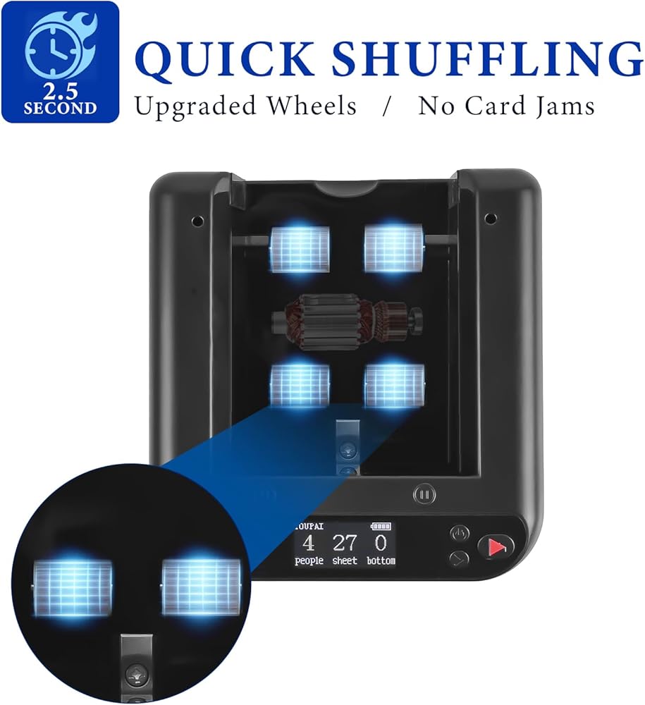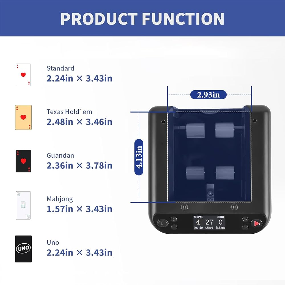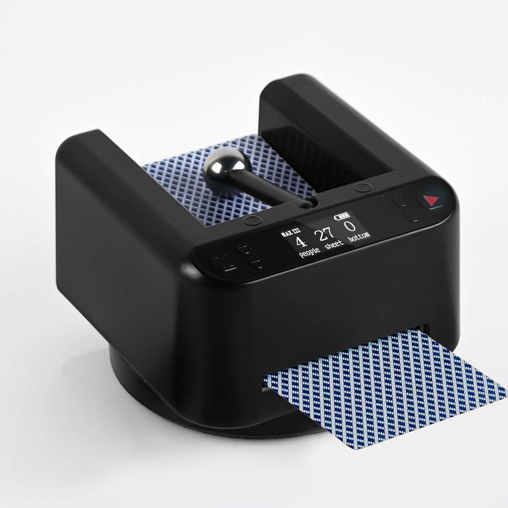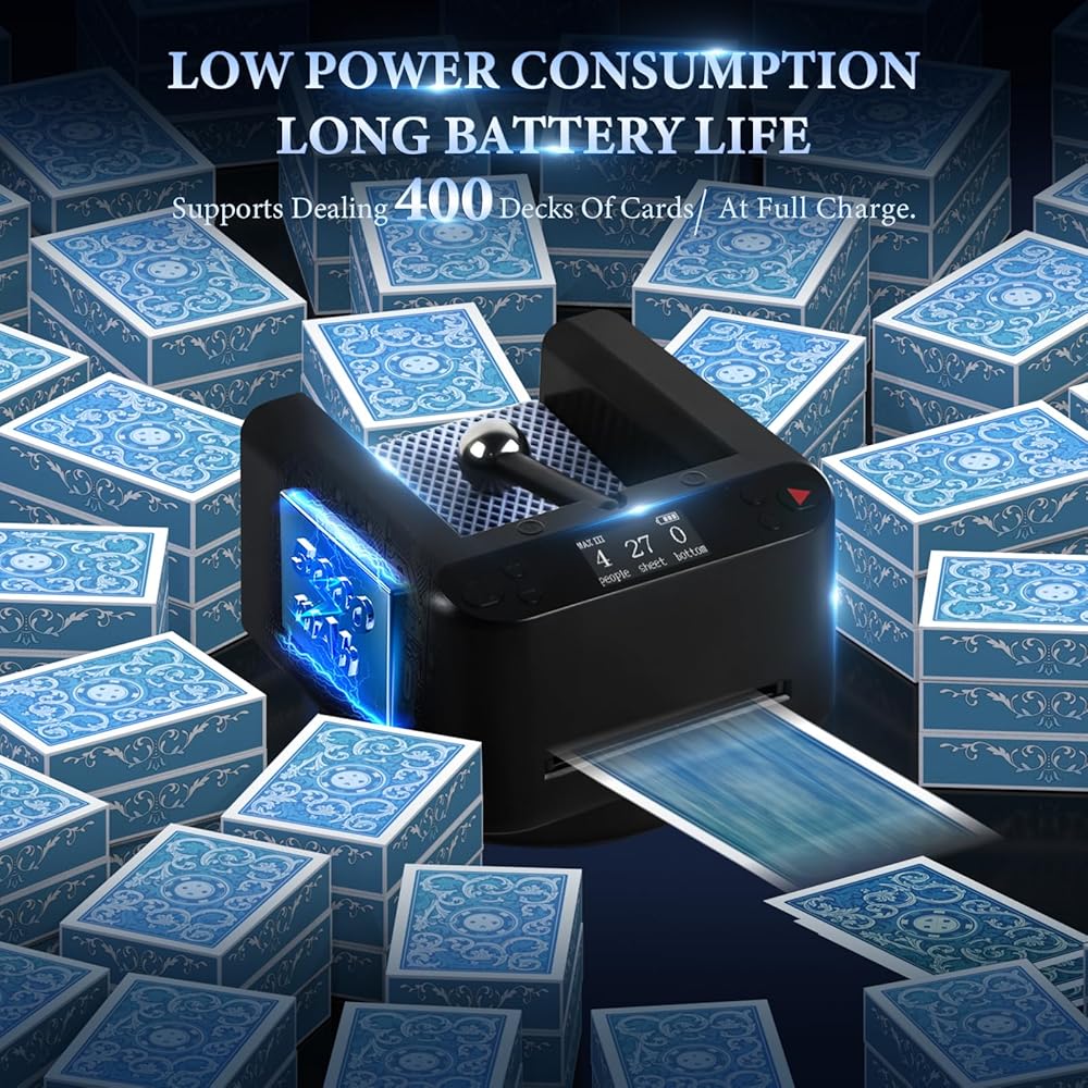 【Automatic Smart Card Dealer】With a 5000mAh battery, enjoy 3-7 days on a single charge. The oversized, shock-absorbing, non-slip base and low-noise dual motors ensure stable and quiet card dealing.