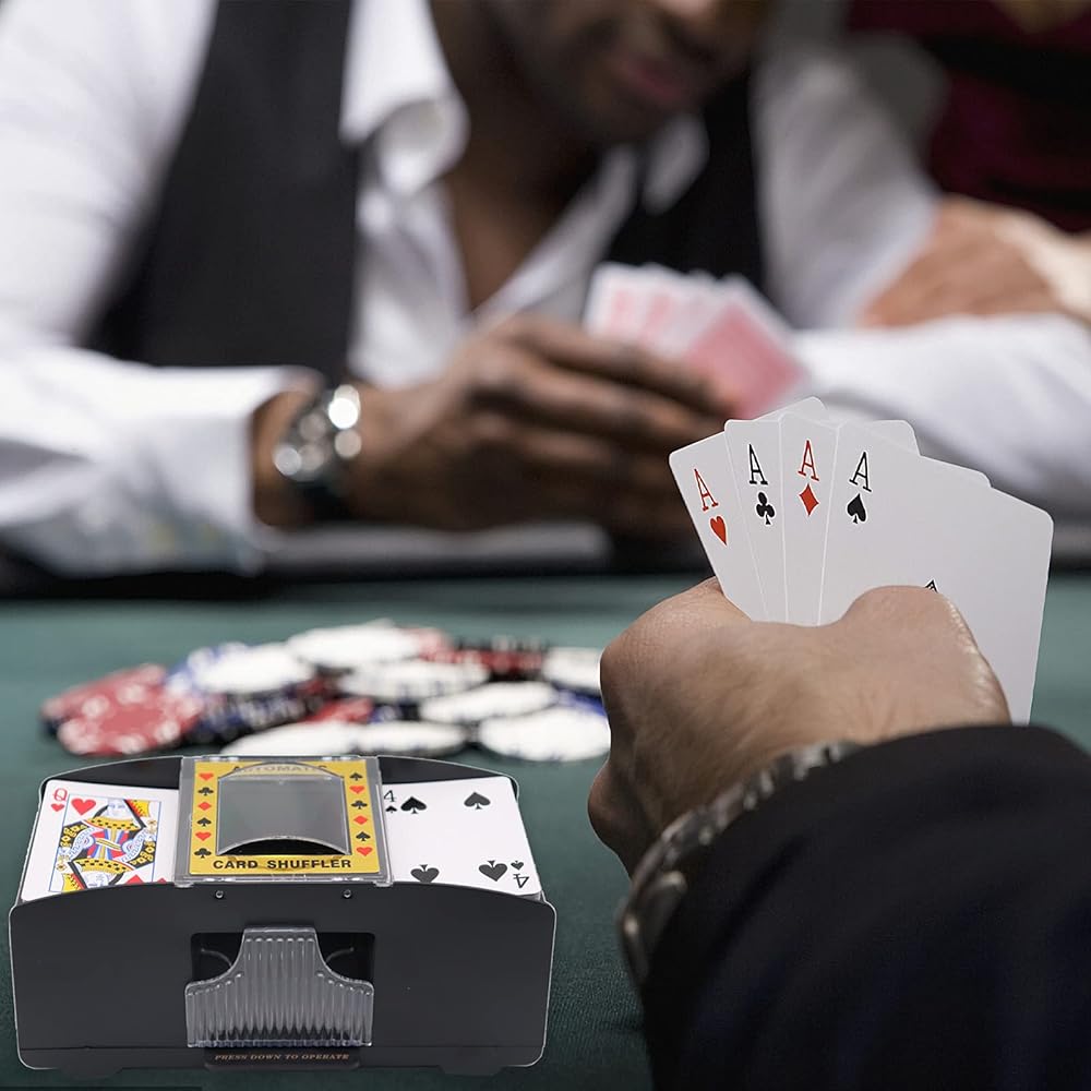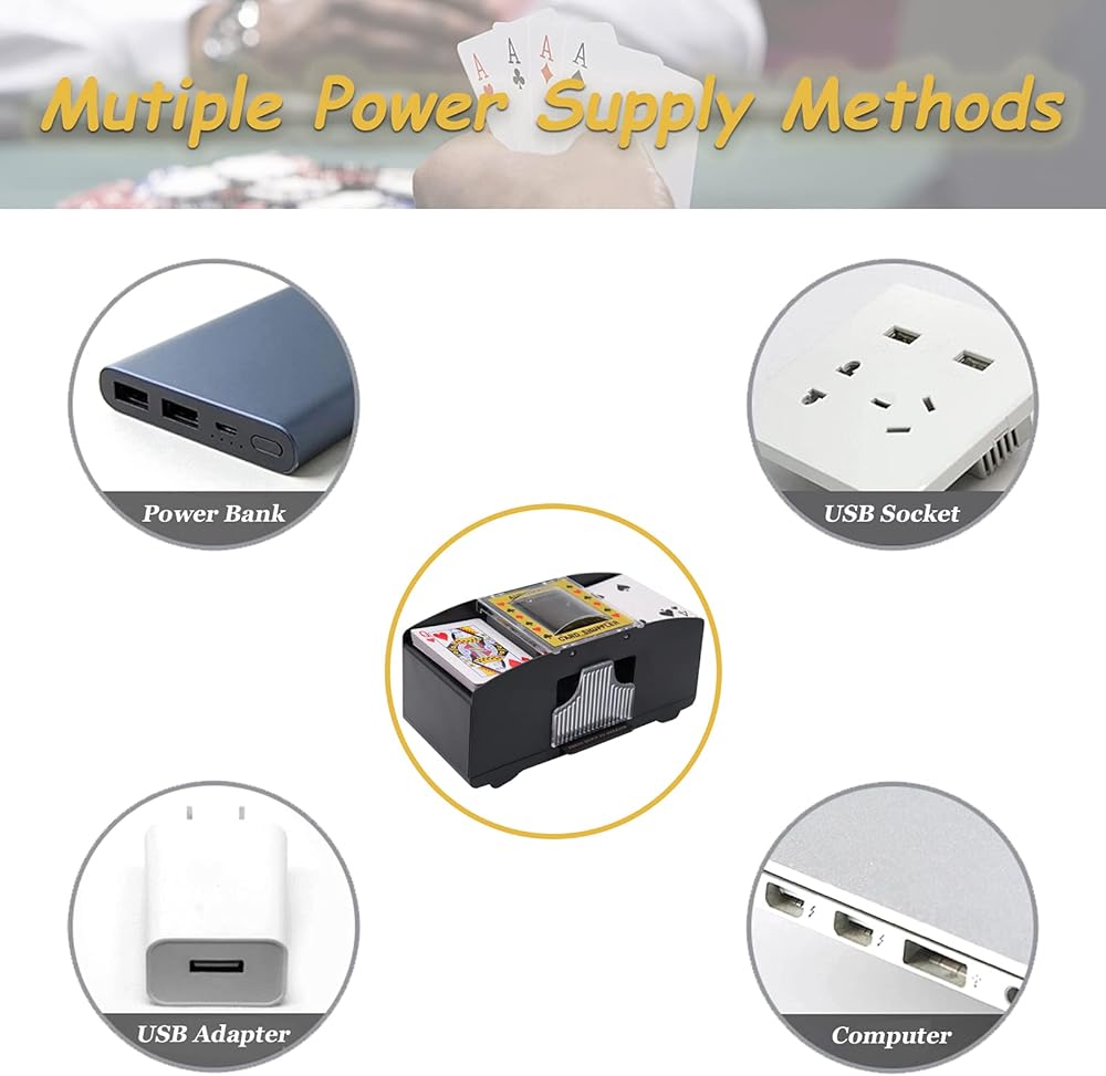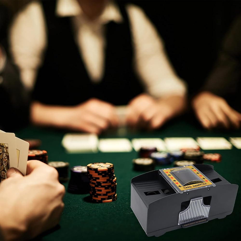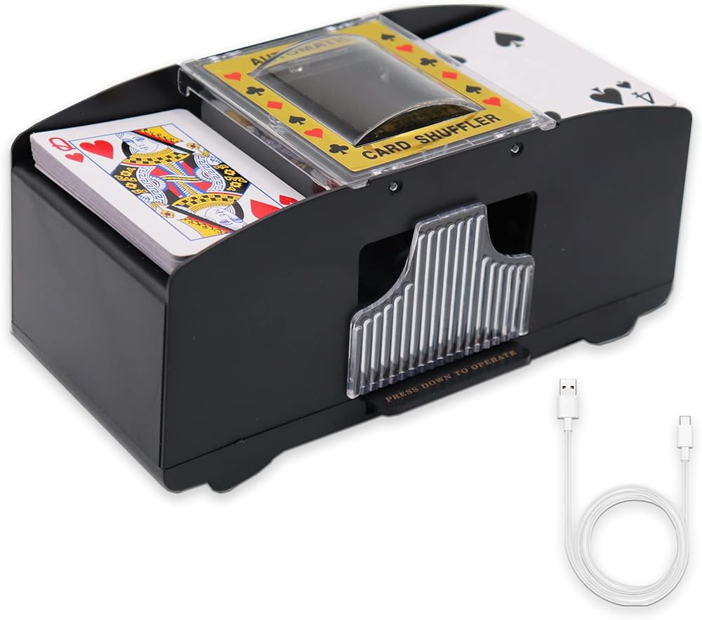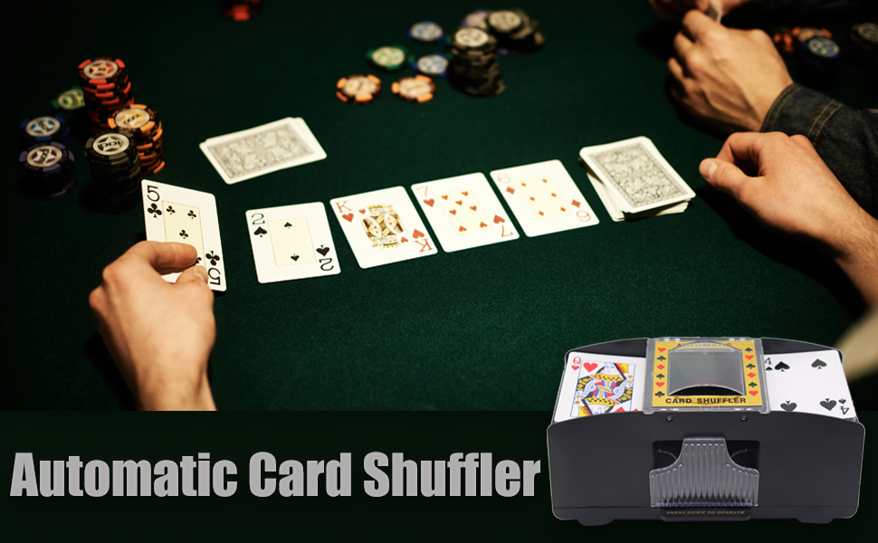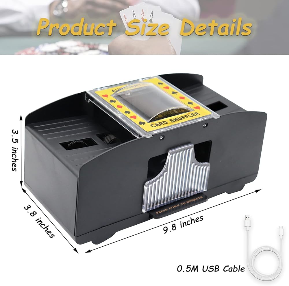 [توفير الوقت] - يتميز نظام خلط البطاقات التلقائي بالمرونة ويعمل مع البطاقات القياسية بحجم البوكر أو البطاقات الضيقة على شكل الجسر. سوف تقوم بسهولة بخلط 1 إلى 2 مجموعة من البطاقات تلقائيًا، لذلك يمكنك قضاء وقت أقل في الخلط ووقت أطول في لعب اللعبة.