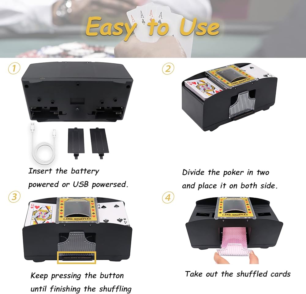 [سهل الاستخدام] - جهاز خلط البطاقات التلقائي هذا سهل التشغيل للغاية. قم بخلط البطاقات بالتساوي قبل خلطها، وادفعها بدقة في كلا الفتحتين، واضغط على الزر برفق، ويوصى بالضغط عليه لفترة قصيرة عدة مرات لتجنب الضغط الطويل الذي يتسبب في انحشار البطاقات. سيتم جمع البطاقات المغسولة بواسطة لوحة التجميع. (نصيحة هامة: سيكون هناك صوت قليل عند تشغيل آلة خلط ورق اللعب.)