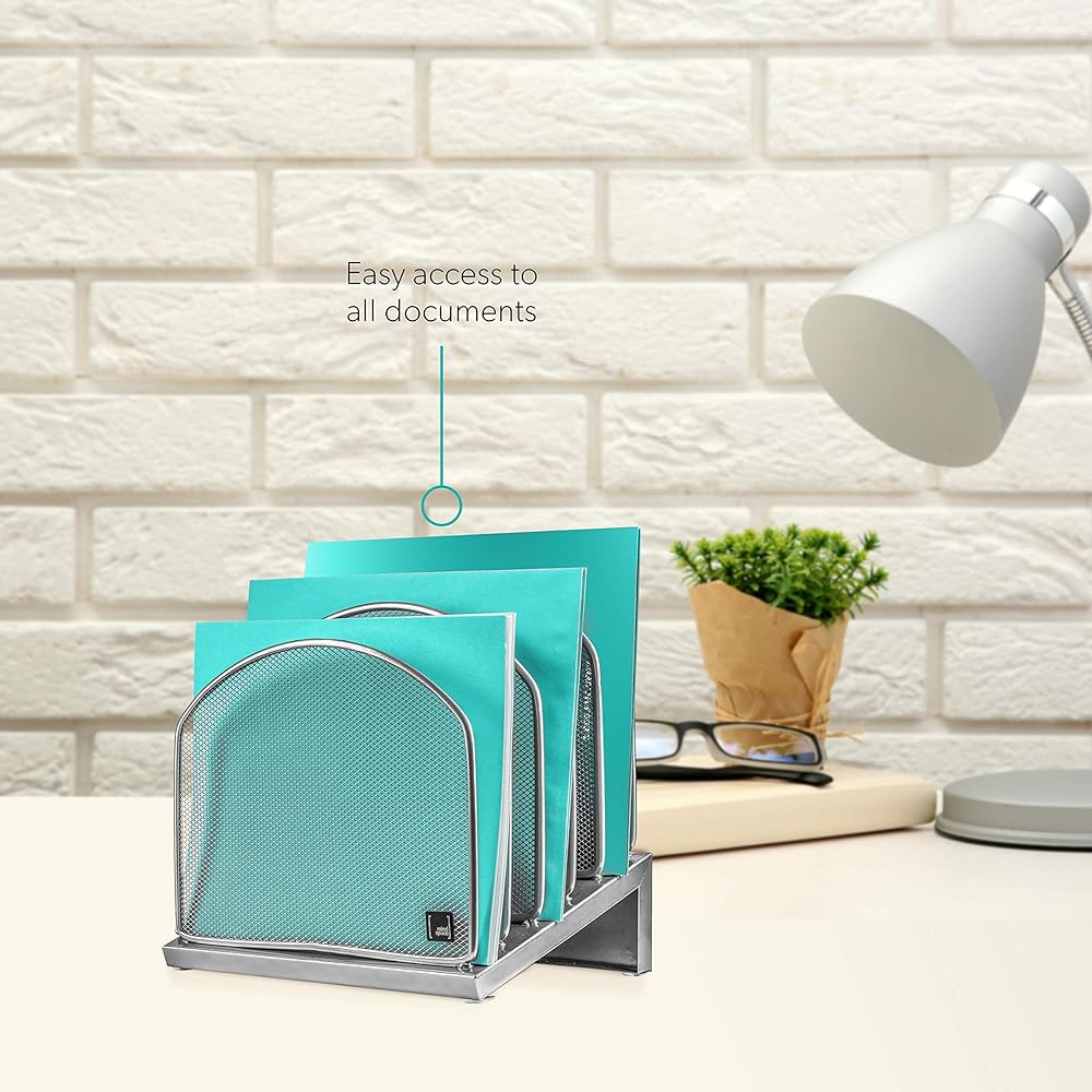 ◀ يمكن الوصول إليها بسهولة. حامل ملفات منظم سطح المكتب شبكي أسود مع فواصل فرز ملفات شبكية ذات طبقات طويلة بما يكفي للحفاظ على الملفات في وضع مستقيم ومرئي في لمحة، وهو مثالي للاستخدام في منزلك أو مكتبك. سيحتفظ منظم مجلد ملفات فارز سطح المكتب بالملفات في متناول اليد وفي نطاق العرض. يتم وضع منظم شفرات الفرز المكتبية بزاوية للحصول على أقصى قدر من الرؤية وسهولة استرجاع الملفات. يحمل الملفات والمجلدات والمظاريف الكبيرة.