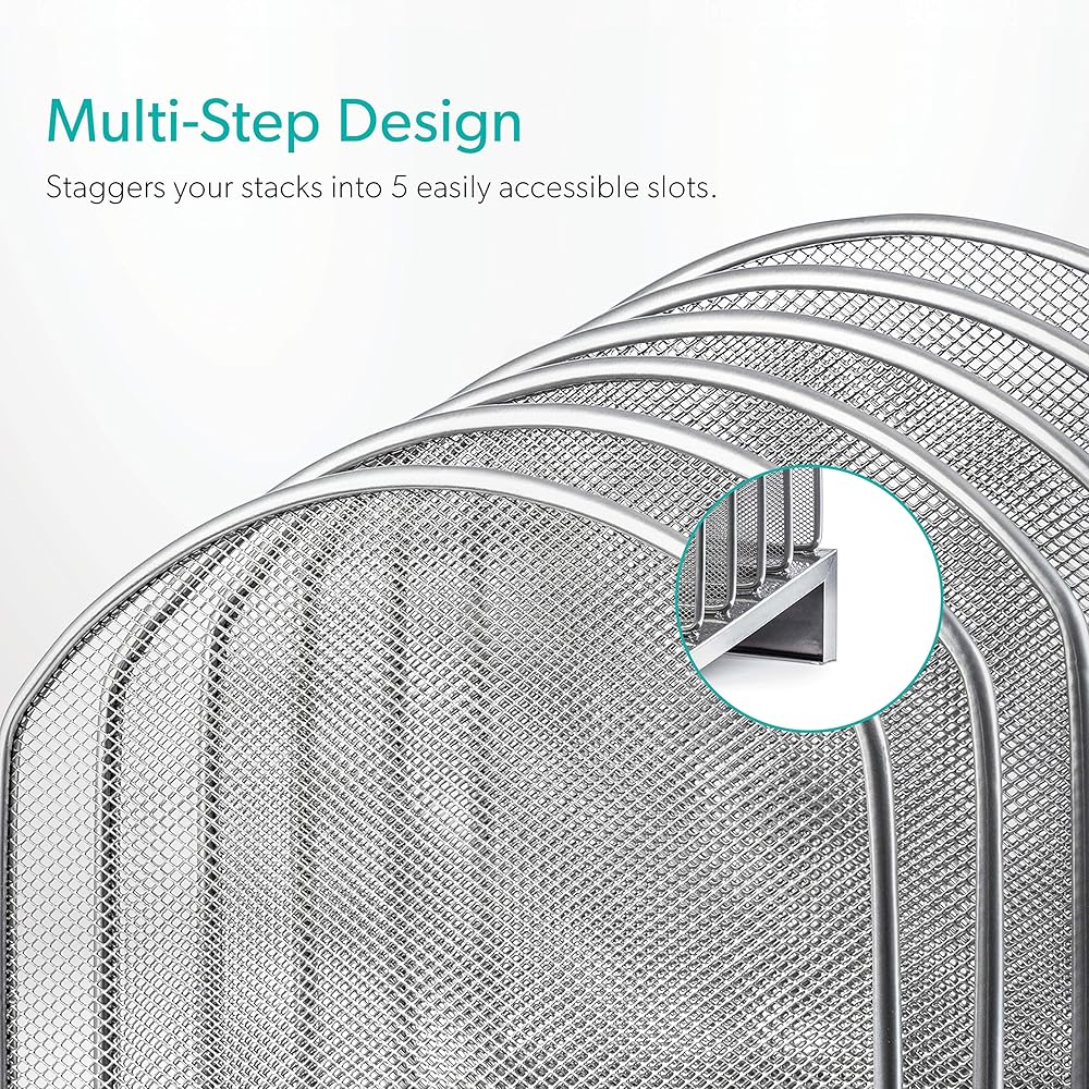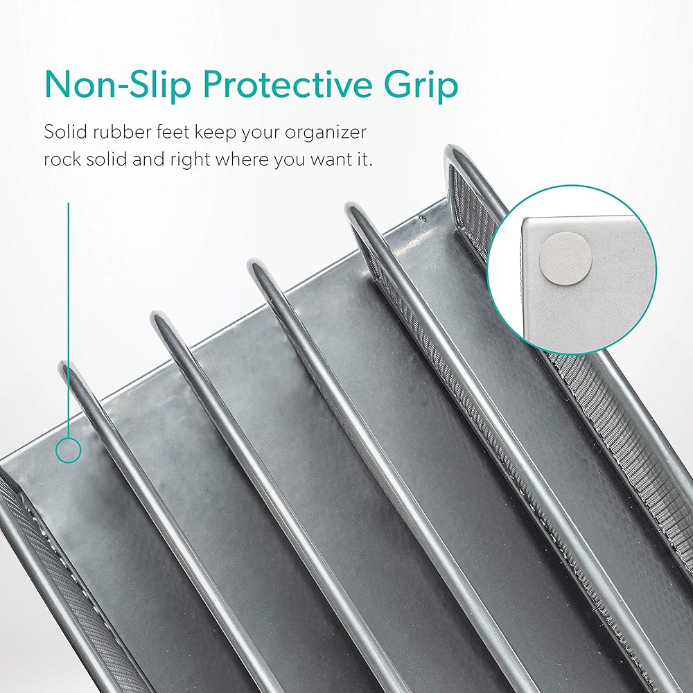 ◀ المتانة. منظم مجلد مكتب عالي الجودة. حامل مجلد ملفات سطح المكتب الشبكي مصنوع من معدن شبكي قوي لتنظيم الملفات العمودية وقاعدة معدنية صلبة توفر الدعم والثبات.