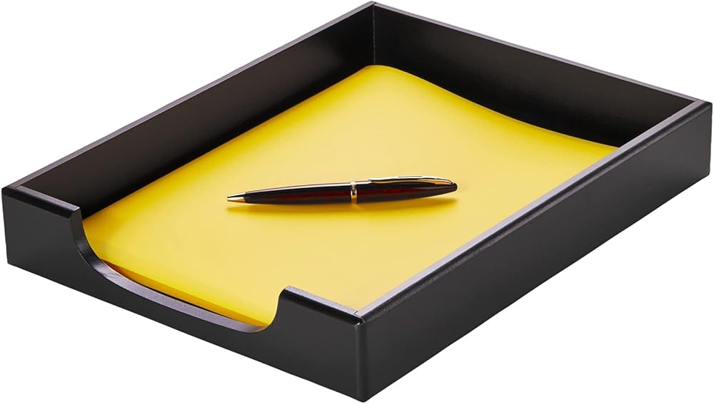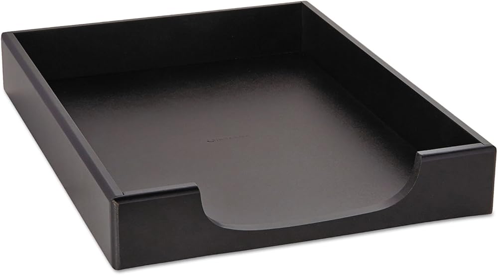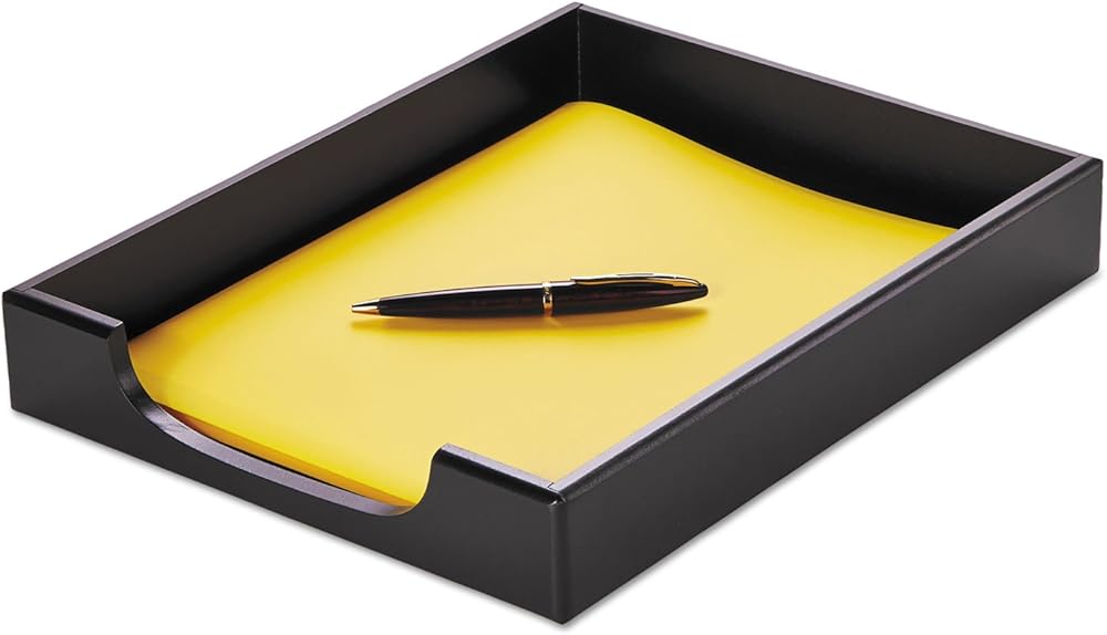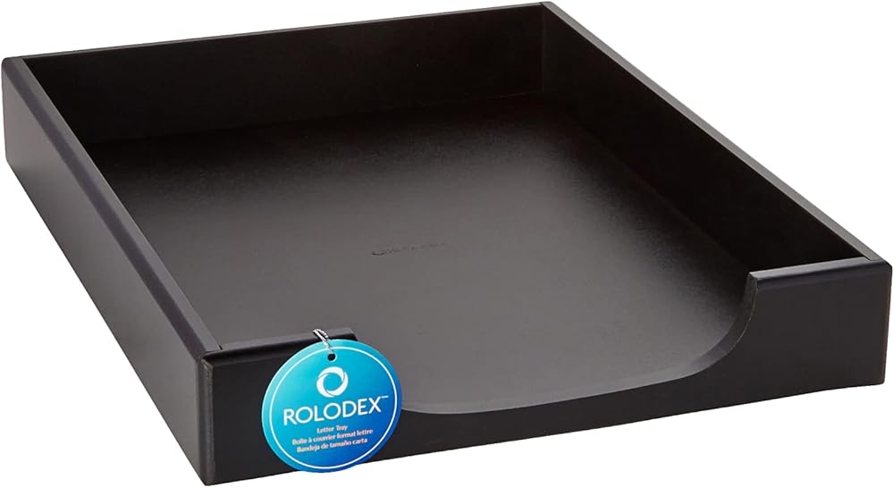 Rolodex Wood Tones Collection Front-Load Letter Tray, Letter-Size, Black (62523). Deep-capacity storage tray has a front-loading design with curved opening that makes it easy to see and get documents. The Wood Tones collection combines solid construction with the warmth of a natural wood grain look and softly rounded edges. Base has non-skid feet to prevent desktop scratches. Holds letter- and A4-size papers, letters, and folders. 13.5 inches long by 10.5 inches wide by 2.12 inches high.