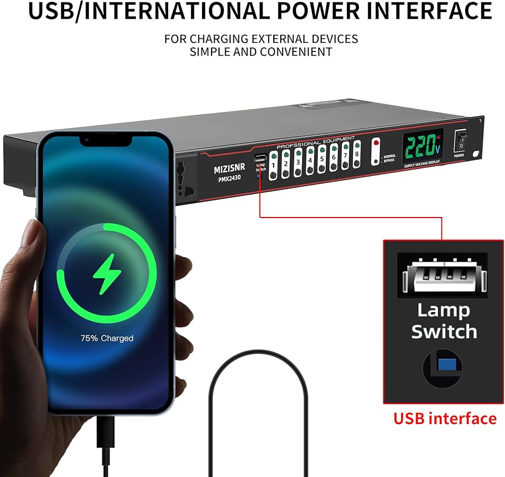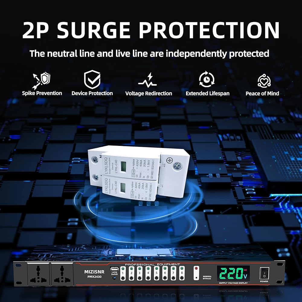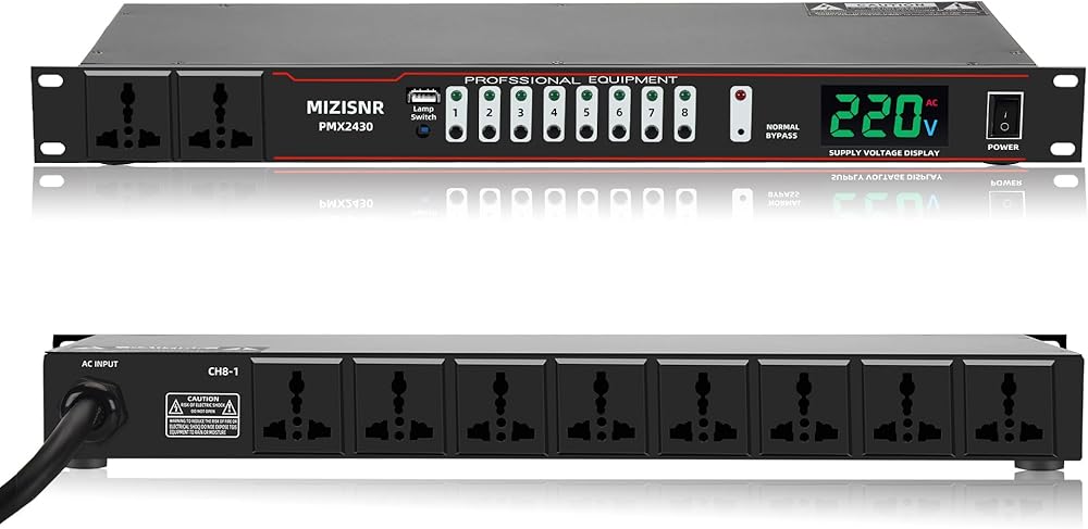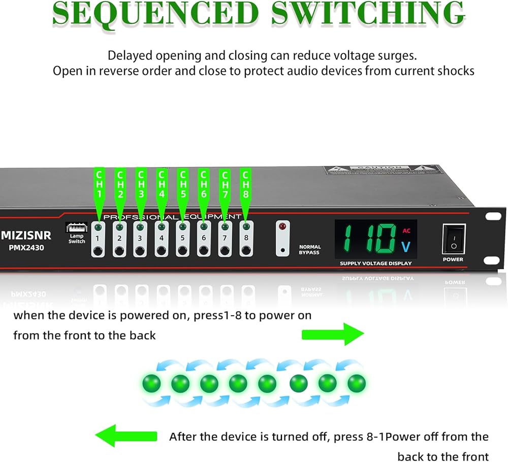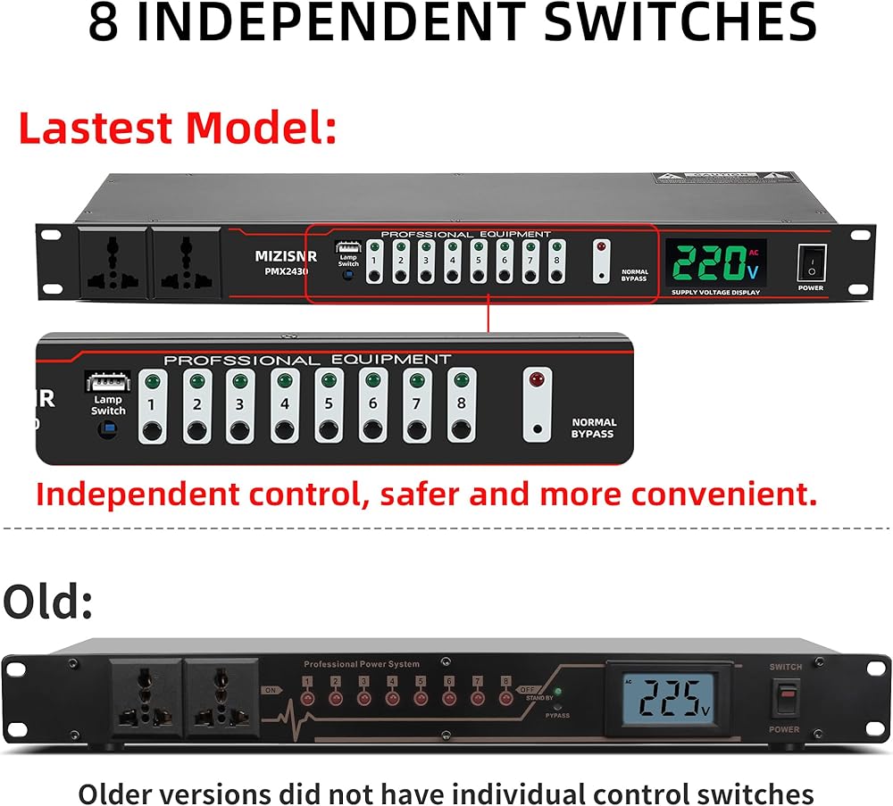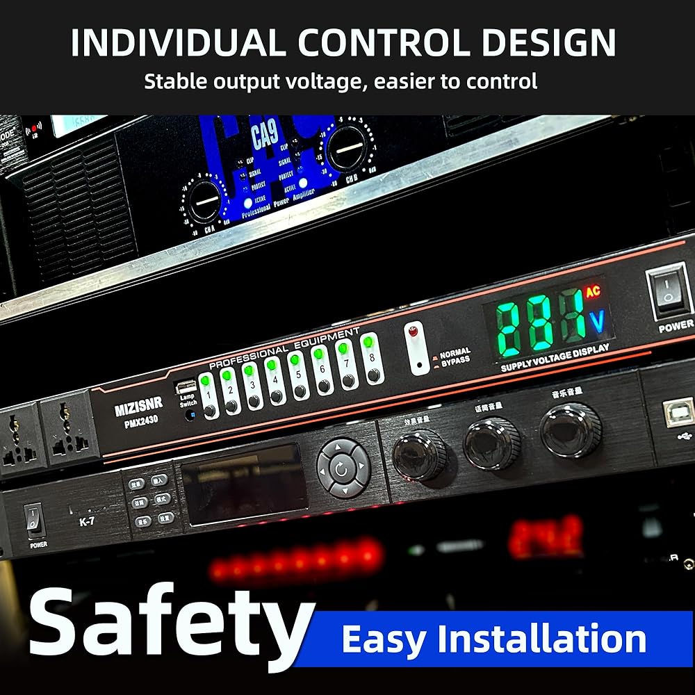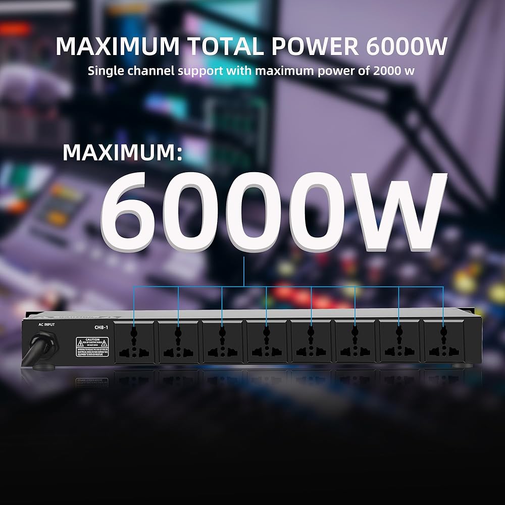• 8 مفاتيح مستقلة للسلامة وسهولة التحكم: تتميز اللوحة الخلفية بـ 8 منافذ متسلسلة وكل منفذ يأتي مع مفتاح فردي ومؤشر على اللوحة الأمامية. مثالية لحماية مكبرات الصوت وغيرها من المعدات القيمة.