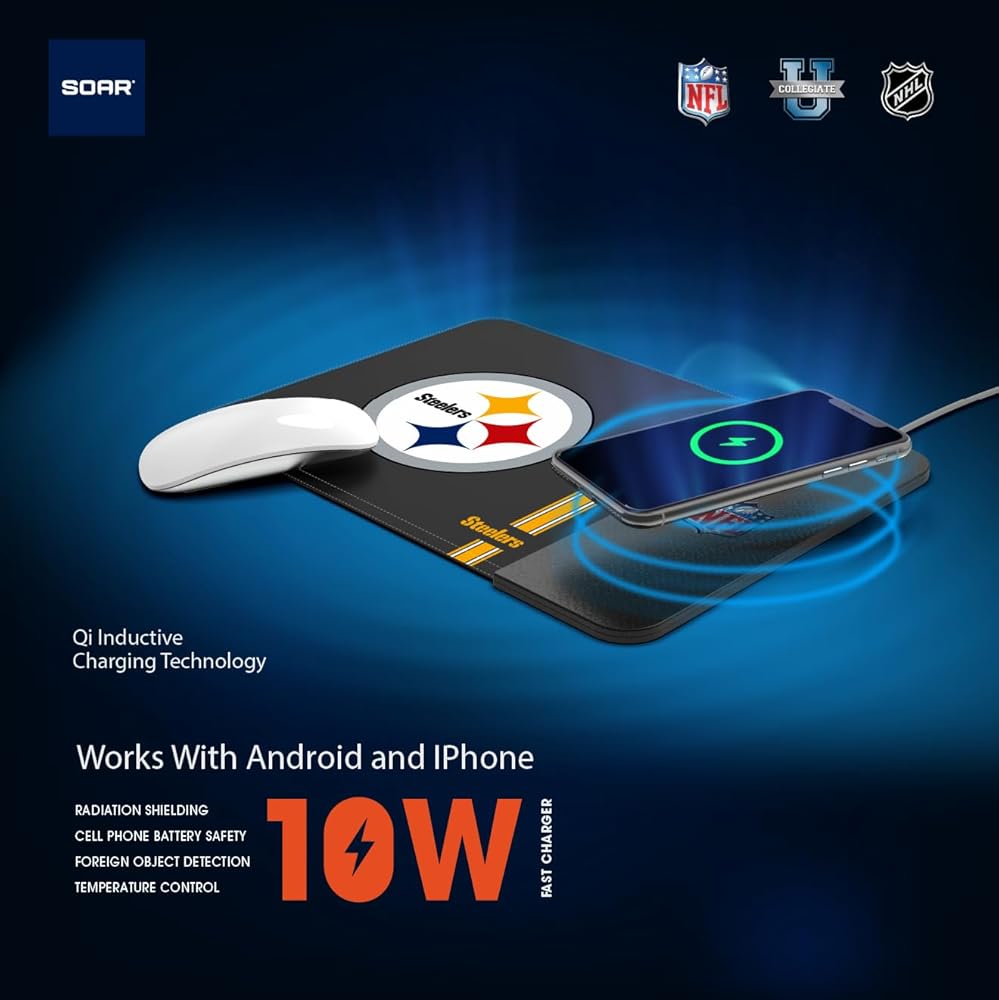 Charge your tech while working without adding bulk to your desktop! Featuring your team's official logo, the 10w offers a fast charge. Qi certified and slim phone case friendly, just drop onto the charging area and keep up to date with all the highlights. Charging cable included.