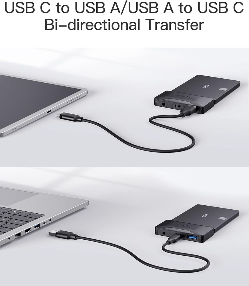 • يمكن للكابل ثنائي الاتجاه الذي يأتي مع هذا المحول نقل البيانات في أي من الاتجاهين بينما يمكن استخدام معظم كابلات USB فقط لنقل البيانات من جهاز USB C إلى مضيف USB، مما يجعل محول SATA إلى USB خيارًا مثاليًا سواء كان متصلاً يحتوي الجهاز على منفذ USB C أو منفذ USB A، قم بالتوصيل والتشغيل.