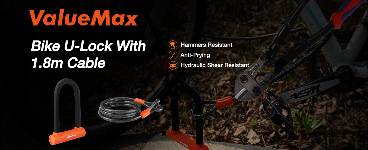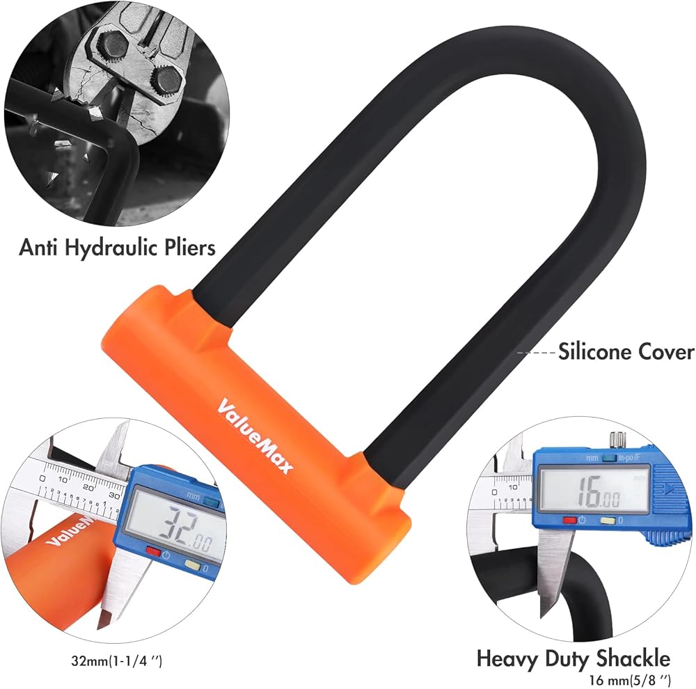 قفل على شكل حرف U للدراجة من ValueMax مع كابل، قفل على شكل حرف U للدراجة شديد التحمل، وقيد 16 مم وكابل أمان بطول 6 أقدام مع دعامة تثبيت قوية ومفاتيح للدراجات