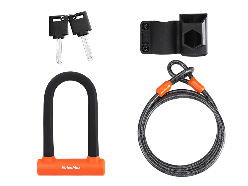 【محتويات العبوة】 تتضمن العبوة 1 قفل على شكل حرف U عالي التحمل، و1 كابل قفل للدراجة، ومفتاحين، و1 دعامة تثبيت.