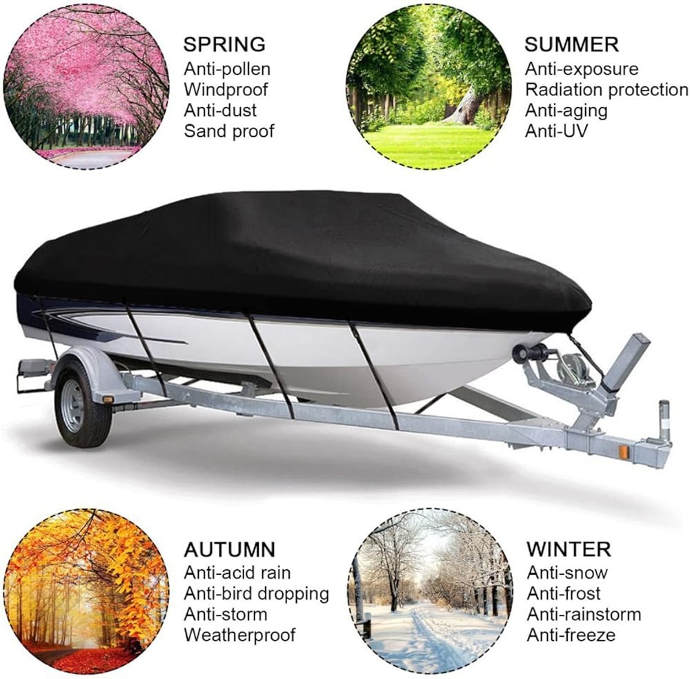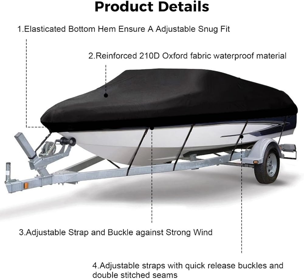 • All-Weather Protection: Double stitching seams provides 100% waterproof and protect your boat from all weathers, keeping your boat dry and clean even in a heavy storm. Dual rear air vents reduce wind pressure and prevent moisture build-up under the boat cover. Withstand tearing, fading, wetting, and cold cracking, keeping your boat protected from harsh weather all year-round.