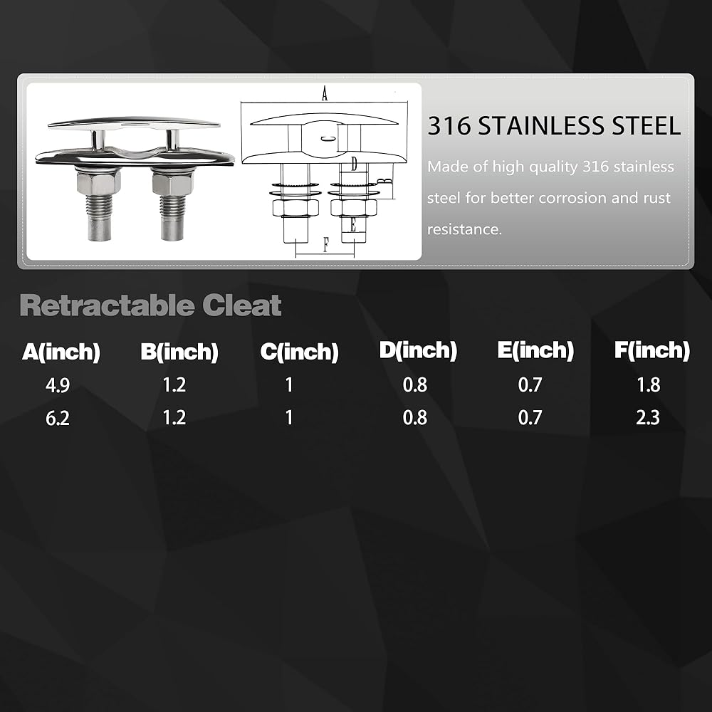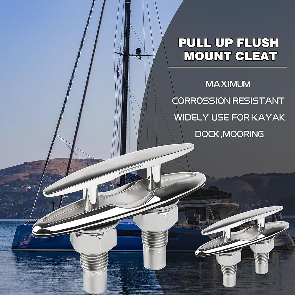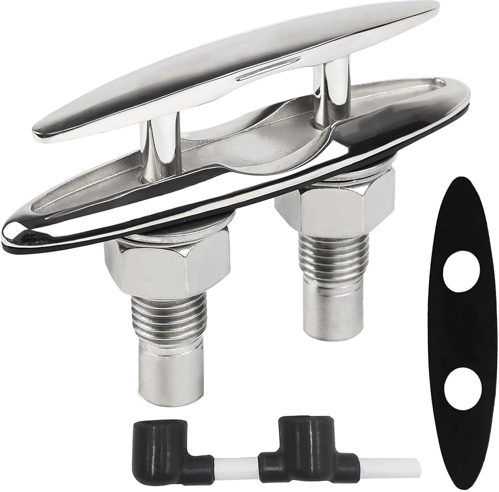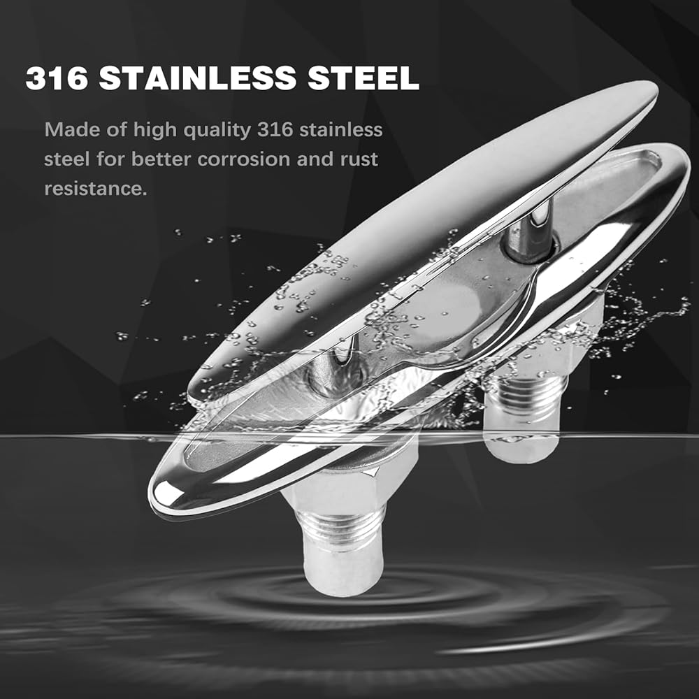 5 Inch(125mm) Retractable Low-Profile Cleat Stainless Steel 316 Pull Up Flush Mount Dock Boat Deck Mooring Rope Neat Cleat Material: 316 stainless steel,resistant to seawater corrosion; Surface: Mirror polished,smooth and beautiful ; Color: Silver; Drain hole inner diameter size: Accommodate 1/4" drain pipe; The pull up cleat with rubber drainage accessories , and the inside of the deck can be kept dry; With 1.7mm thick rubber gasket, the pull up cleats can be installed perfectly. There is no gap between the cleats and the deck, and no water seepage; The retractable dock cleat edge is smooth and will not damage the rope; Pull Up Cleat is suitable for bass boats, fishing boats, cruisers, kayaks, dinghies, jet boats, pontoons, utility boats, and even some small cabin boats; Package Includes: Retractable Cleat x 1; Nuts(SS 316) x 2 ; Lock Washers(SS 316) x 2 ; Flat Washers(SS 316) x 2; Rubber drainage accessories x 1; Rubber gasket x 1;