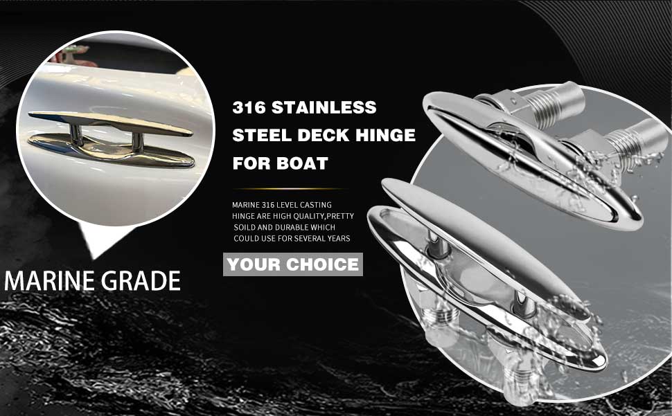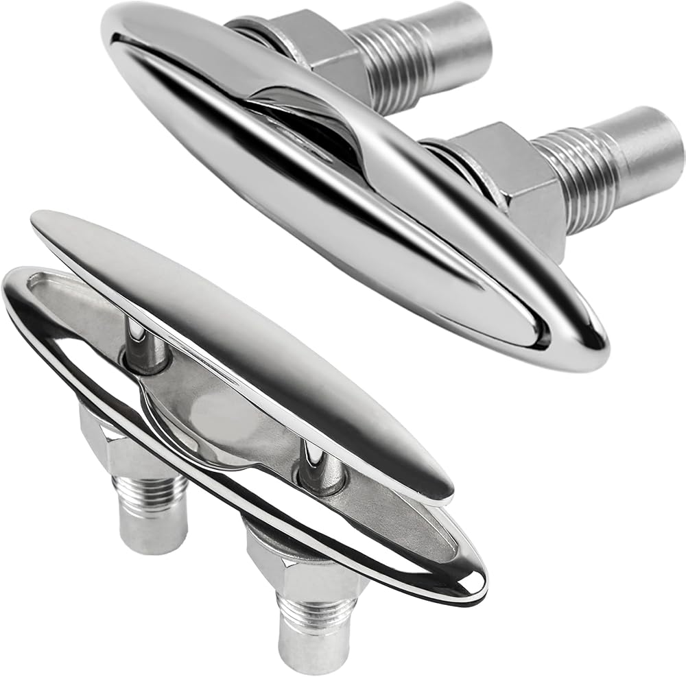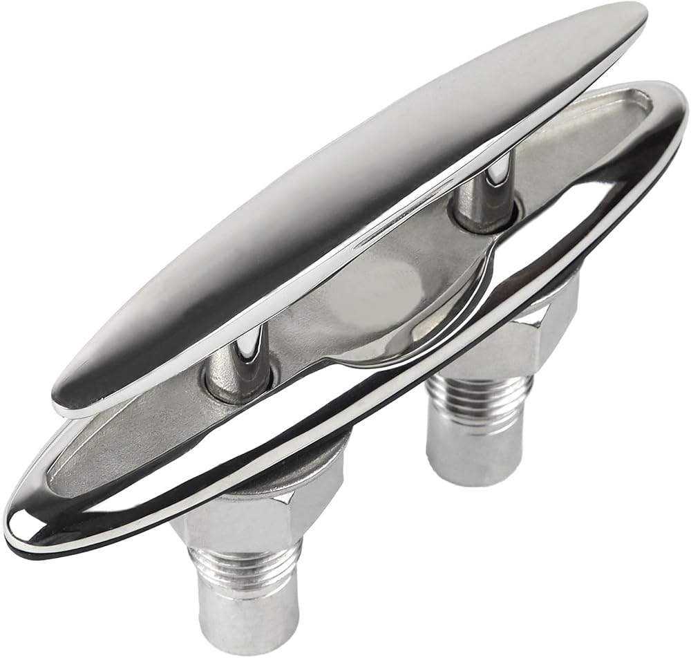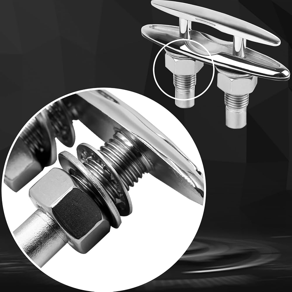 5 Inch(125mm) Retractable Low-Profile Cleat Stainless Steel 316 Pull Up Flush Mount Dock Boat Deck Mooring Rope Neat Cleat Material: 316 stainless steel,resistant to seawater corrosion; Surface: Mirror polished,smooth and beautiful ; Color: Silver; Drain hole inner diameter size: Accommodate 1/4" drain pipe; The pull up cleat with rubber drainage accessories , and the inside of the deck can be kept dry; With 1.7mm thick rubber gasket, the pull up cleats can be installed perfectly. There is no gap between the cleats and the deck, and no water seepage; The retractable dock cleat edge is smooth and will not damage the rope; Pull Up Cleat is suitable for bass boats, fishing boats, cruisers, kayaks, dinghies, jet boats, pontoons, utility boats, and even some small cabin boats; Package Includes: Retractable Cleat x 1; Nuts(SS 316) x 2 ; Lock Washers(SS 316) x 2 ; Flat Washers(SS 316) x 2; Rubber drainage accessories x 1; Rubber gasket x 1;