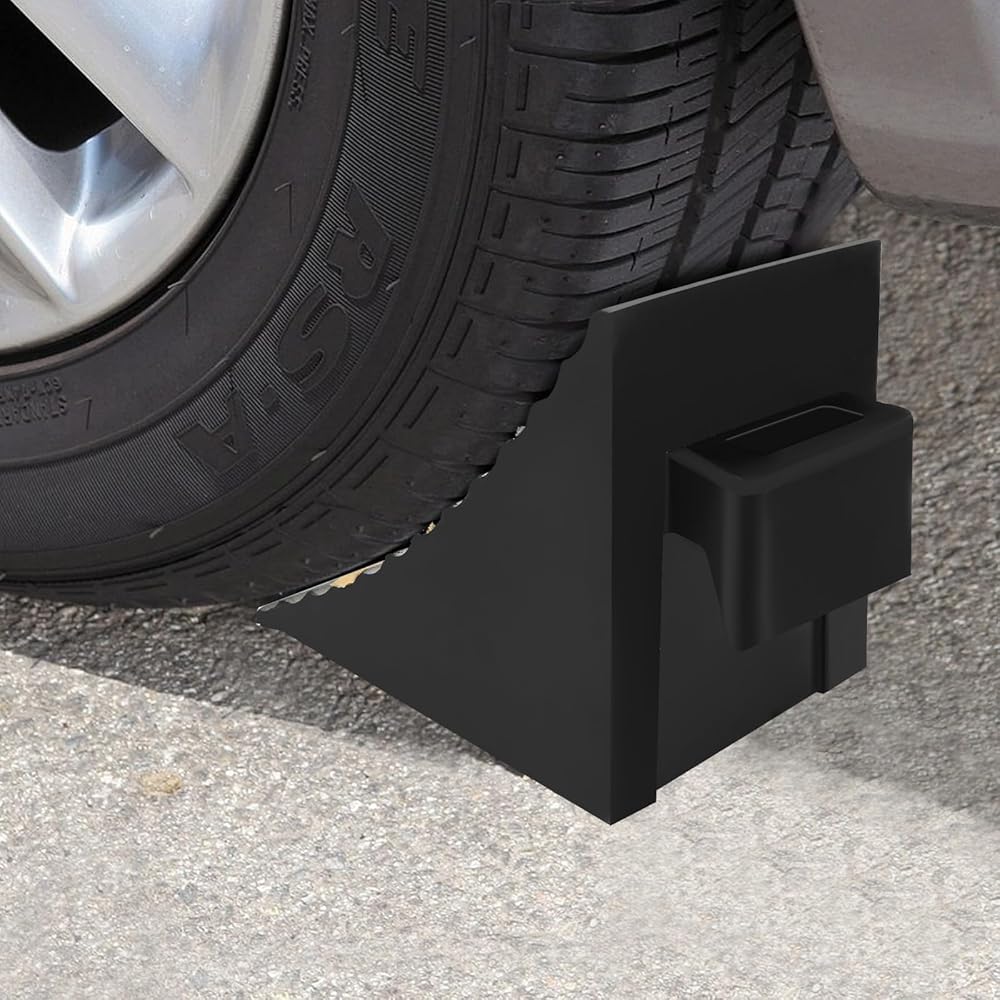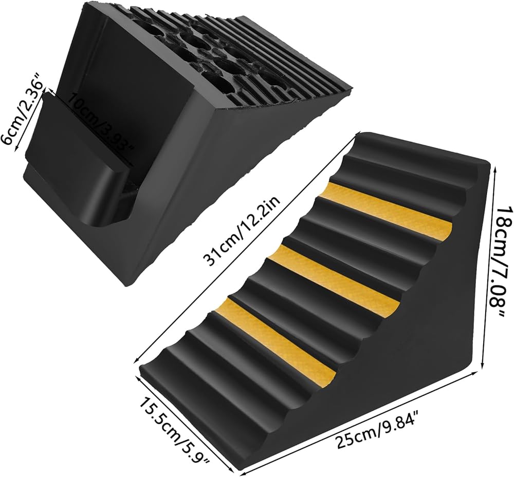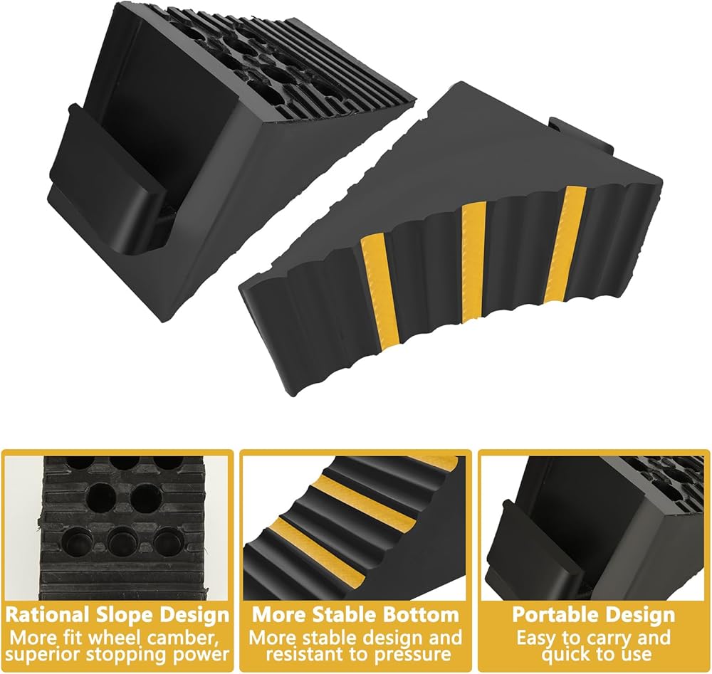 • SPECIAL DESIGN: Our tire chocks feature a unique triangular design with ribbed and textured bottom, providing maximum grip. They also have a built-in rubber handle for easy and safe positioning, removal, and transportation. The large 7.5-inch height prevents even the heaviest vehicle, RV, or trailer from rolling back (even on large truck tires), ensuring secure parking on any downhill slope.