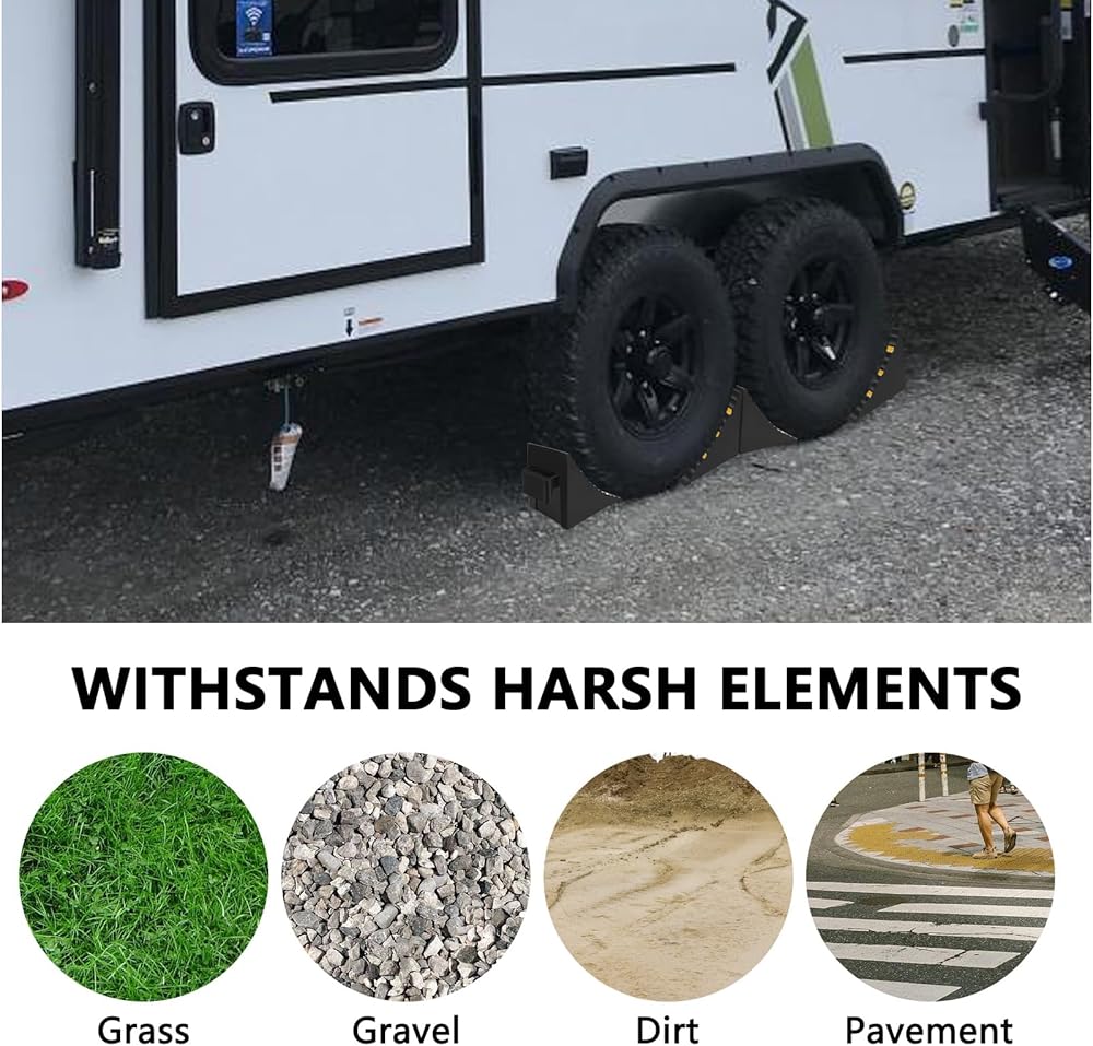 • ALL-WEATHER NYLON REINFORCED RUBBER: Unlike cheap plastic or rubber wheel chocks that shatter, slip, rip, or crack, these wheel chocks are made of reinforced nylon and rubber, making them solid and 2x stronger than regular rubber. They are designed to withstand dirt, dust, salt, ice, mud, sun, sand, and heat.