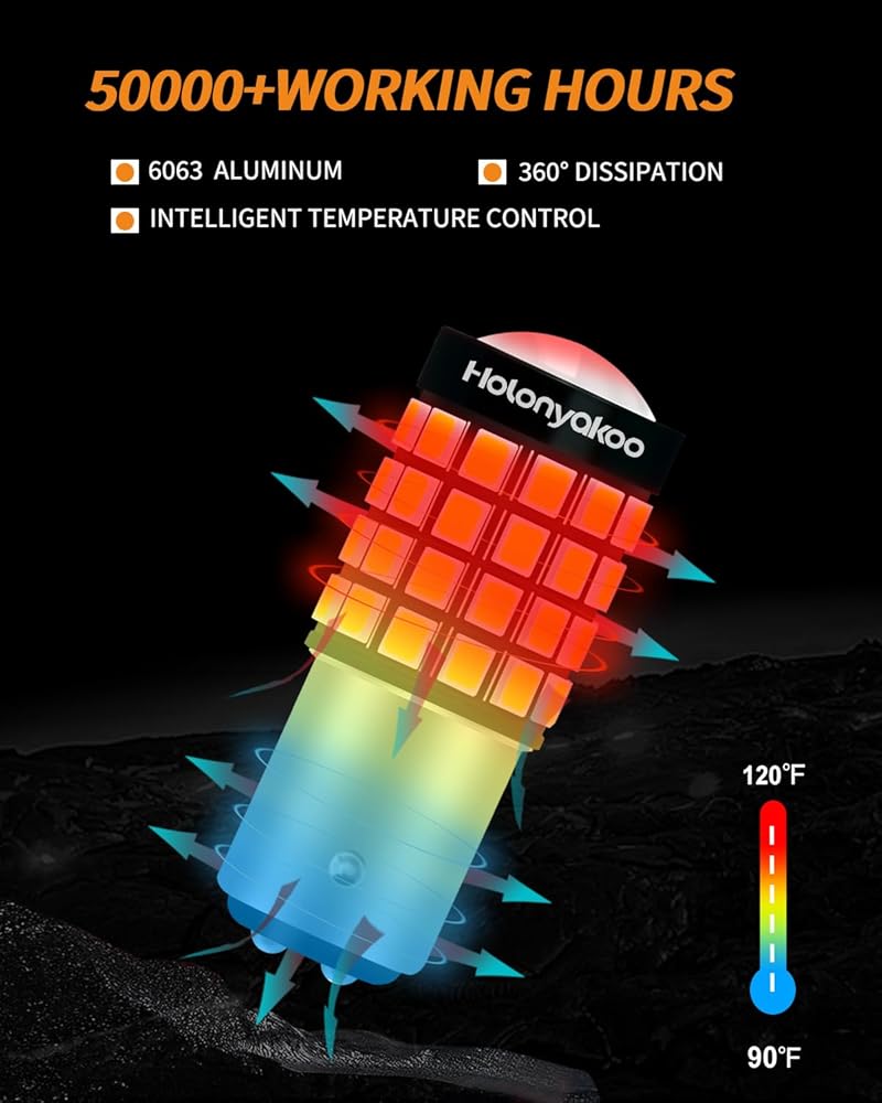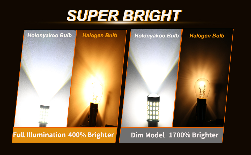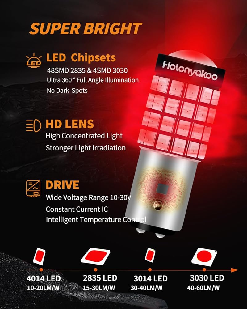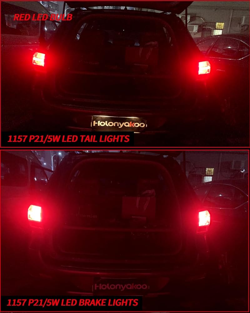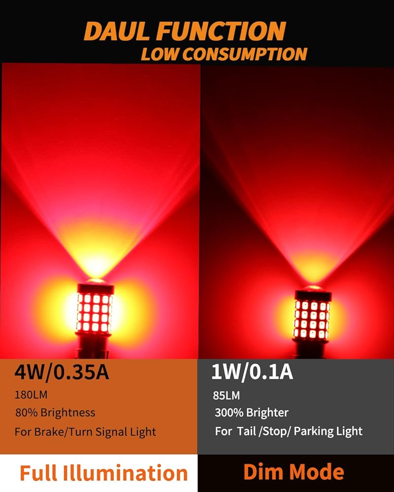 سطوع فائق: 48SMD2835+4SMD3030 رقائق LED لكل لمبة، (وضع السطوع) 7 وات/قطعة، 1200 لومن/قطعة، معدل توفير الطاقة 67%، 400% أكثر سطوعًا؛ (وضع خافت) 1 وات/قطعة، 360 لومن/قطعة 1157 مصباح LED أبيض معدل توفير الطاقة 80%، أكثر سطوعًا بنسبة 1700% من لمبة الهالوجين P21/5W الأصلية
