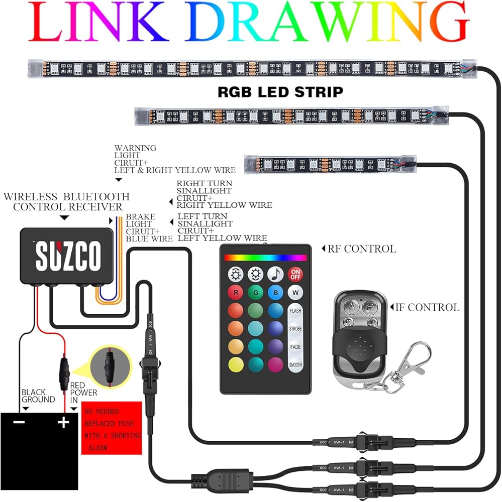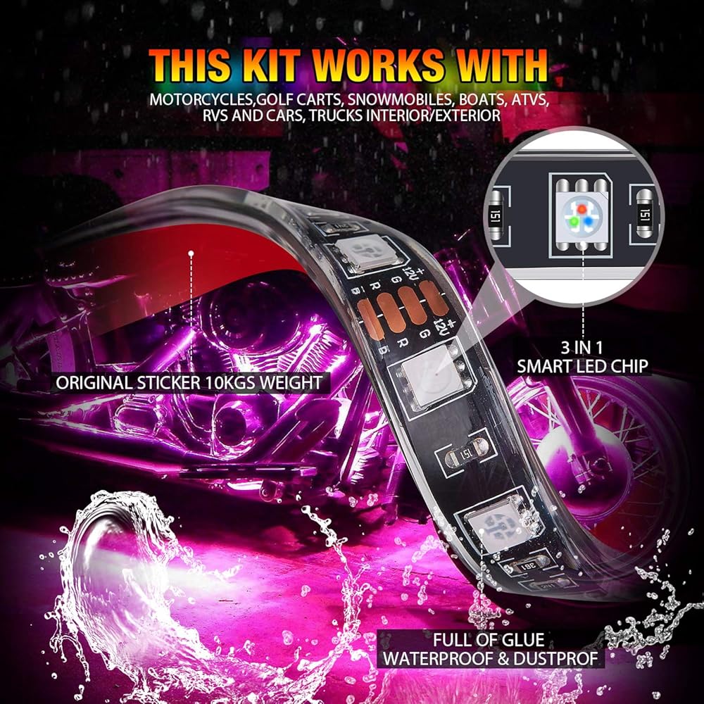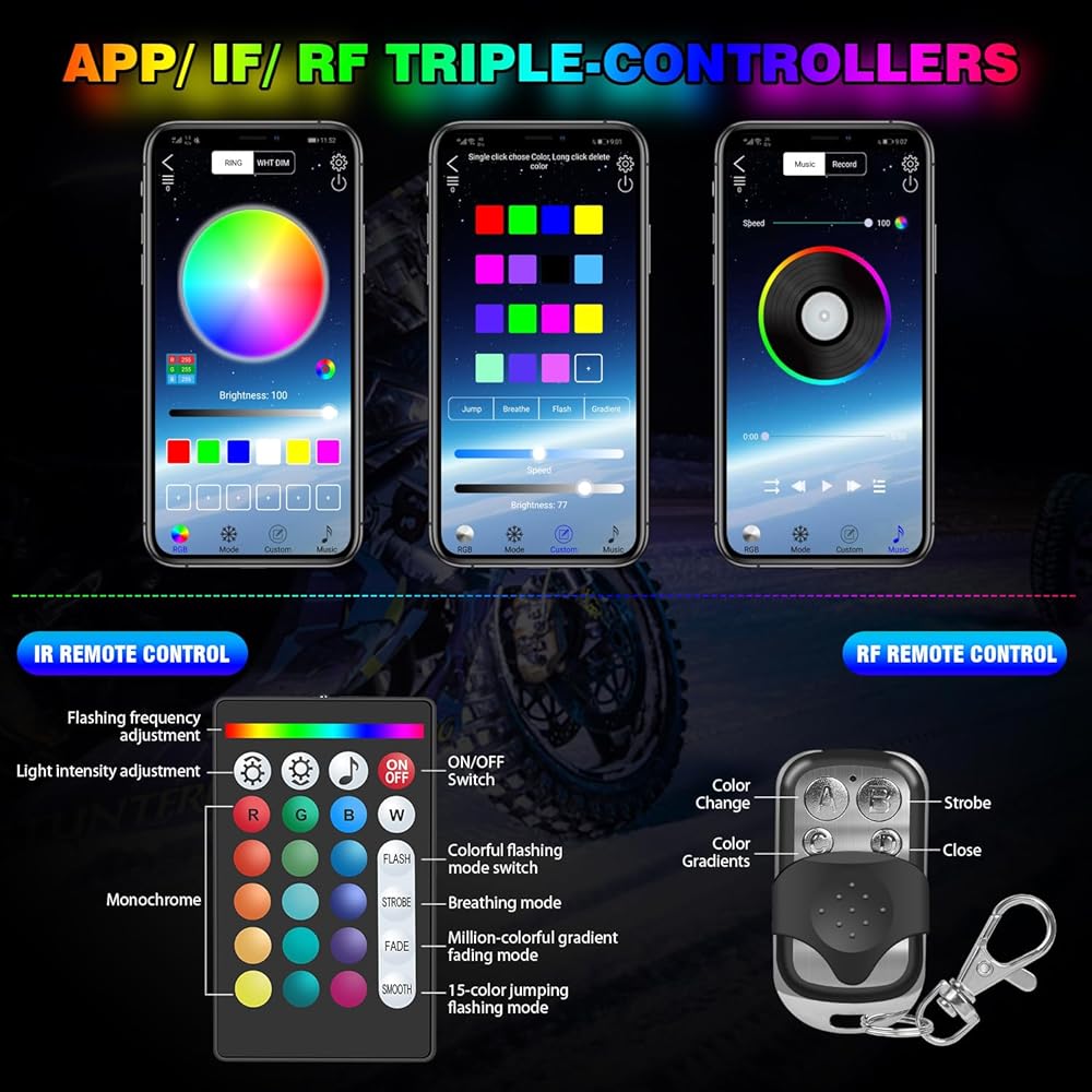 【أجهزة التحكم عن بعد APP/RF/IR】مصباح LED هذا للدراجات النارية مزود بجهاز تحكم عن بعد APP/IR/RF، ومسافة التحكم 32-49FT أو أقل. ستمنحك وظيفة مزامنة الصوت أفضل متعة مع ضوء LED.