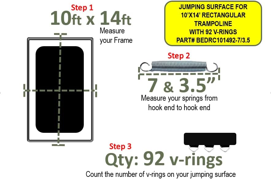 Jumping surface fits 10 ft. by 14 ft. rectangle trampoline frames that use 84-7" & 8-3.5" springs. Springs are not included. Measure trampoline from outside frame to outside frame for correct size when ordering.