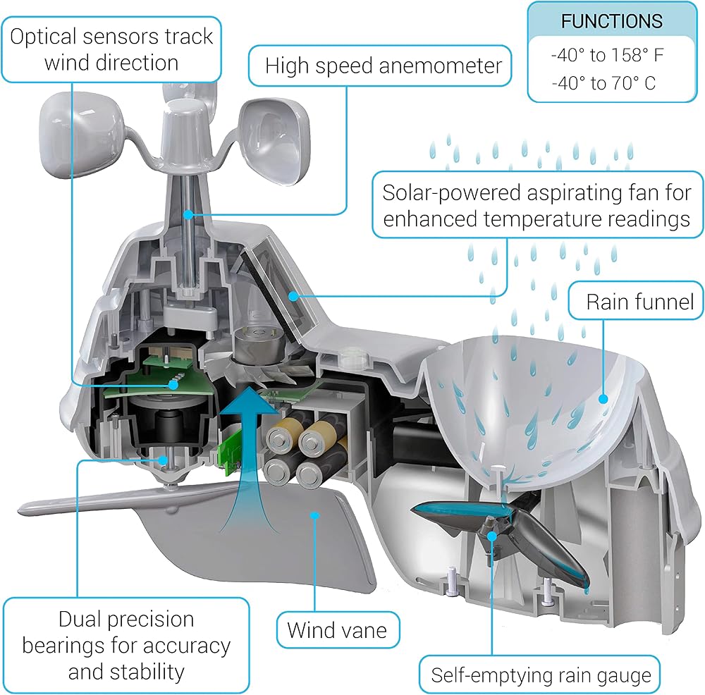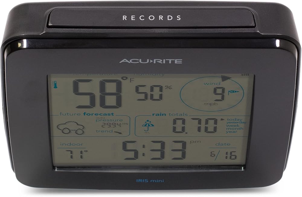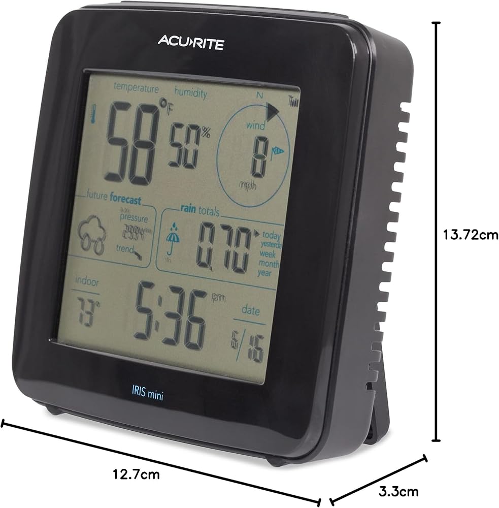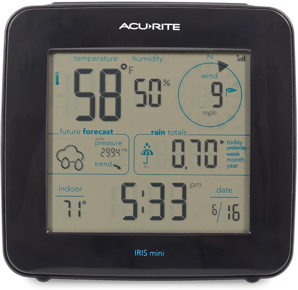 Hyperlocal weather information at your fingertips for home, office, or business use with this AcuRite Weather Station. This professional home weather station allows you to monitor your backyard weather conditions from anywhere, anytime. A Weather Center to Monitor Accurate Weather Conditions, Anywhere: This personal weather station allows you to monitor weather conditions in the home, garden, RV park, or any precise location. Enjoy the benefits of an anemometer, rain gauge, wind vane, hygrometer, and thermometer all in one wireless device. Many customers enjoy utilizing this home weather station as a wireless forecast station due to its reliable forecasting technology. Using the built-in weather barometer, the weather station takes 4,000 readings at 12-minute increments to calculate a running average and compute the barometric pressure for your exact location. The pressure accuracy of AcuRite self-calibrating forecasters increases with each new reading over a period of time (Learning Mode). After 14 days, the self-calibrated pressure is reasonably accurate (although the algorithm continues to run; 4,000 readings = 33.33 days) and the weather forecaster is ready for superior weather prediction. Protect your family, house, and garden with minute-by-minute updates in weather changes, including the outdoor temperature, humidity, wind speed/direction, rainfall, and lightning. Plus, the display includes an indoor thermometer and hygrometer to measure indoor temperature, humidity, and barometric pressure. The professional AcuRite weather station is easy to set up, includes mounting hardware, and features a 2-year battery life (not included)..