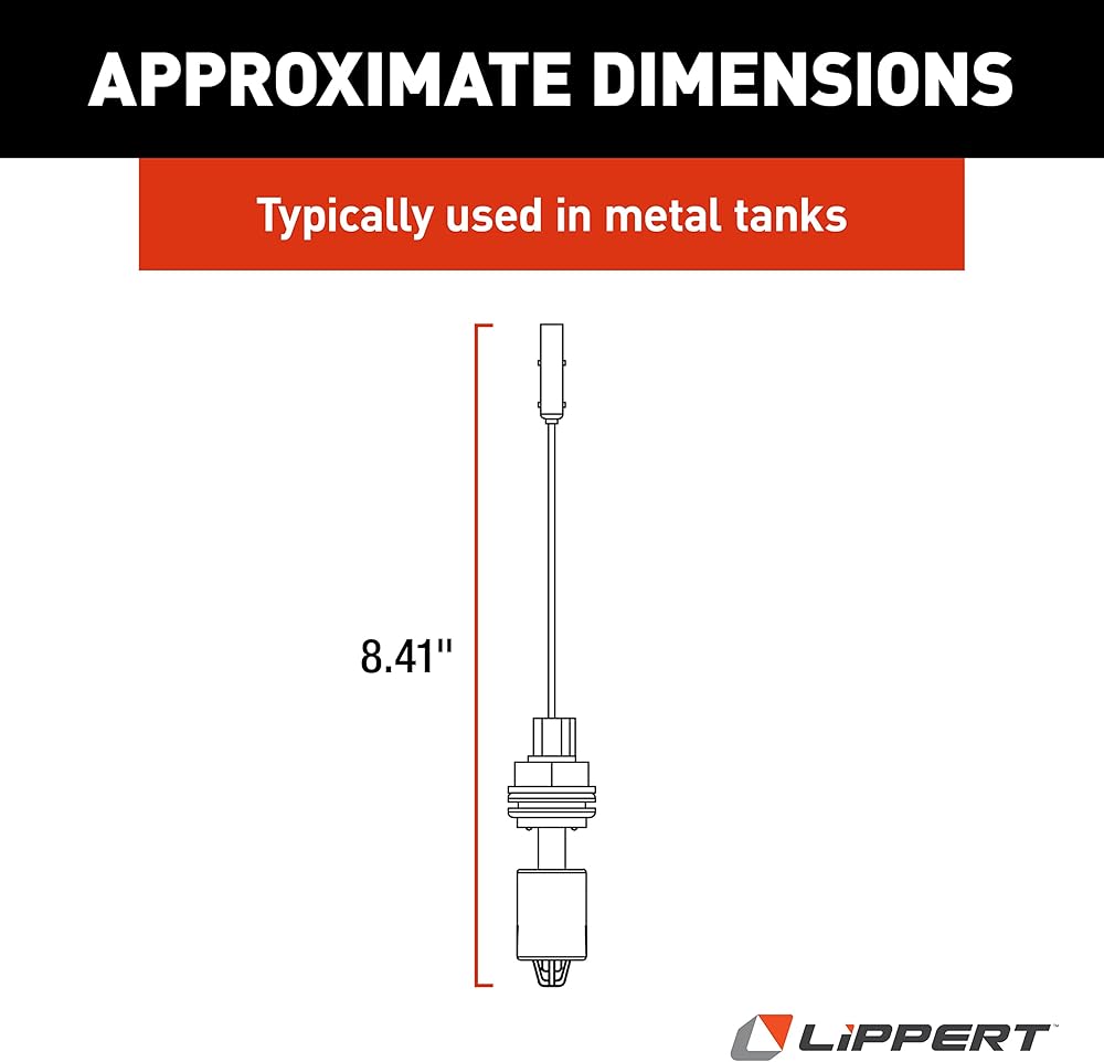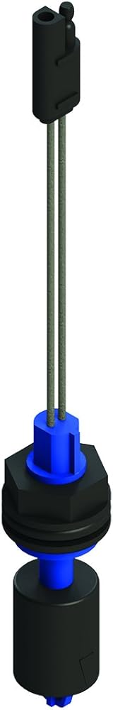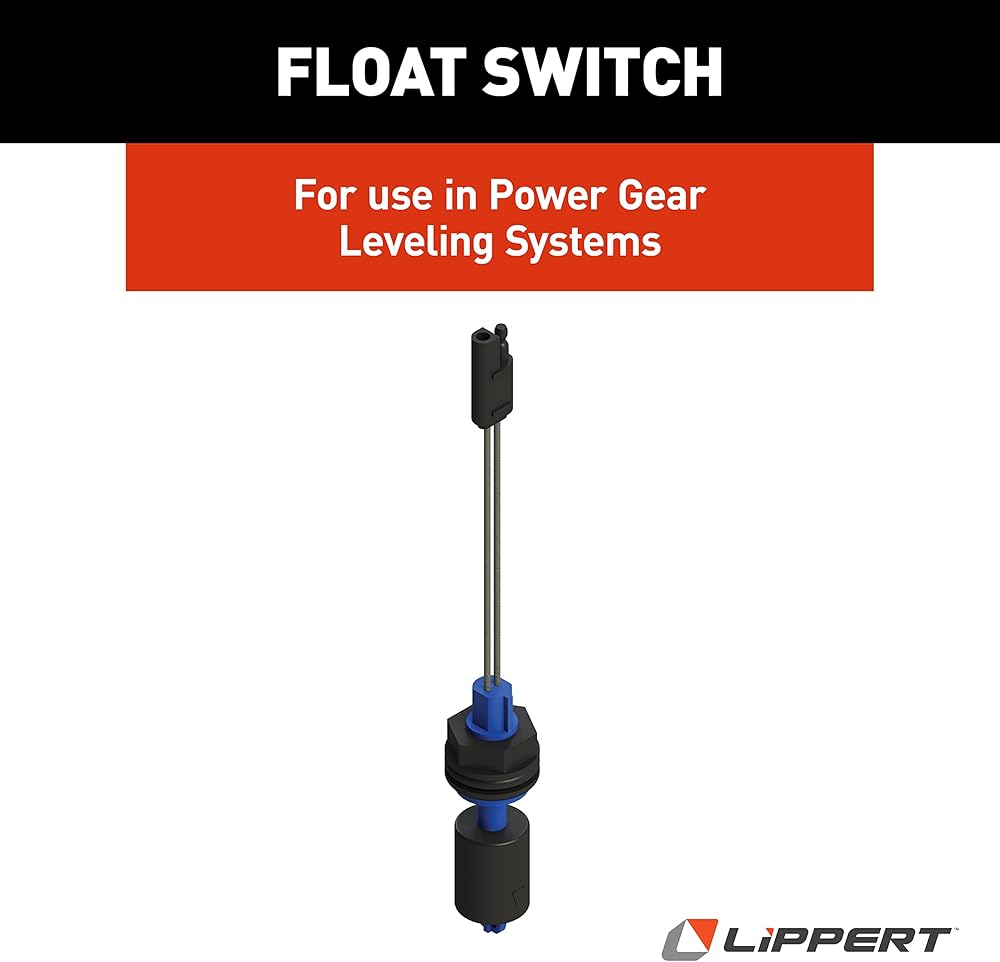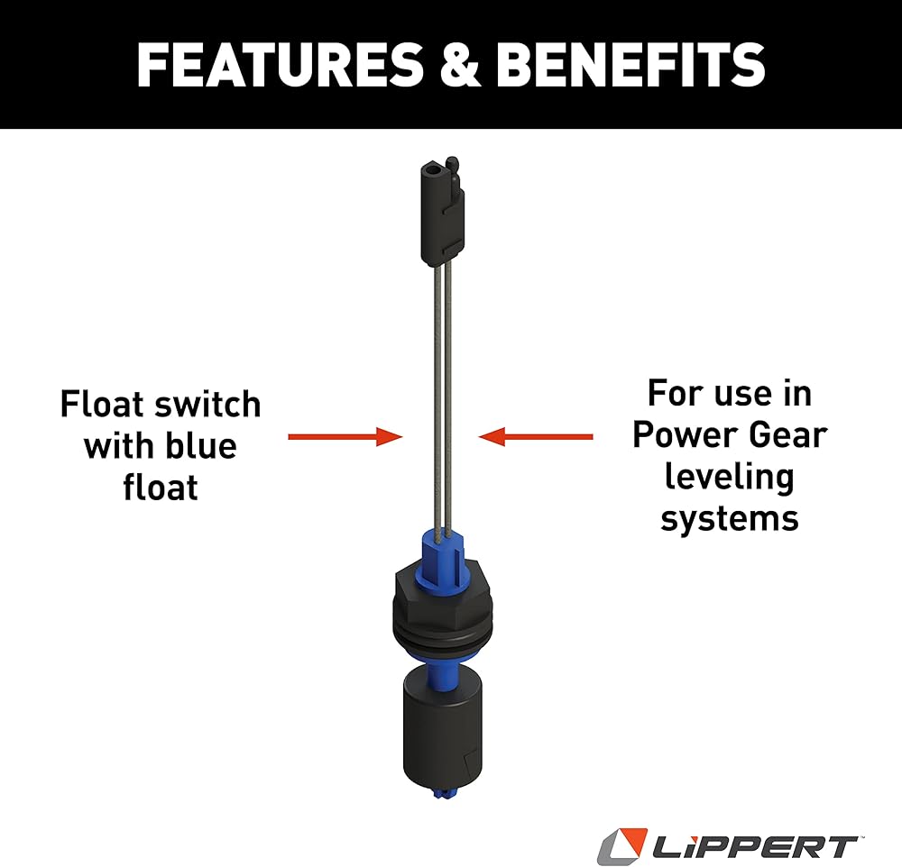 Horizontal fluid Sensor (float switch) with trailer connector, bobber style Blue float, and internal Resistor for power gear leveling hydraulic systems with spring return jacks. Typically used in metal tanks. Pg. : 140-1146.