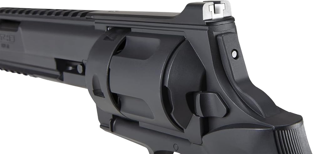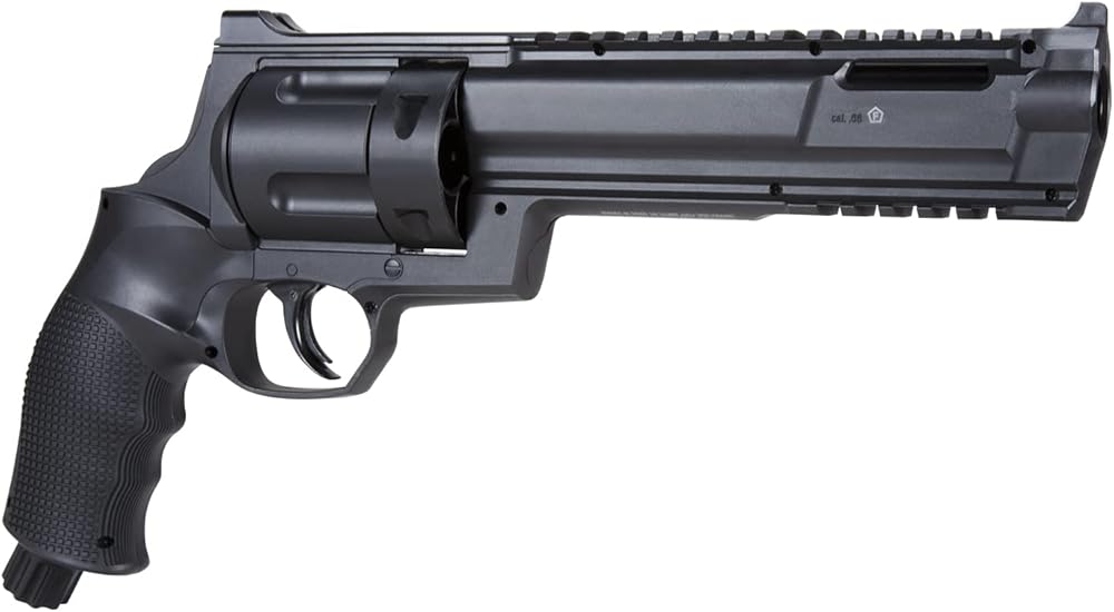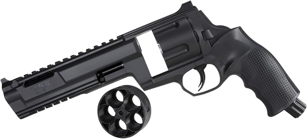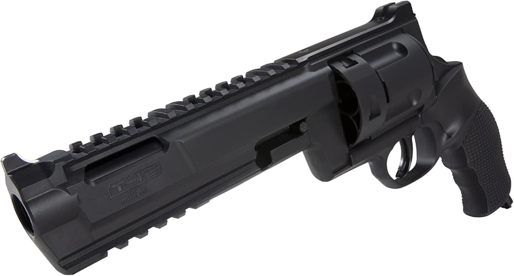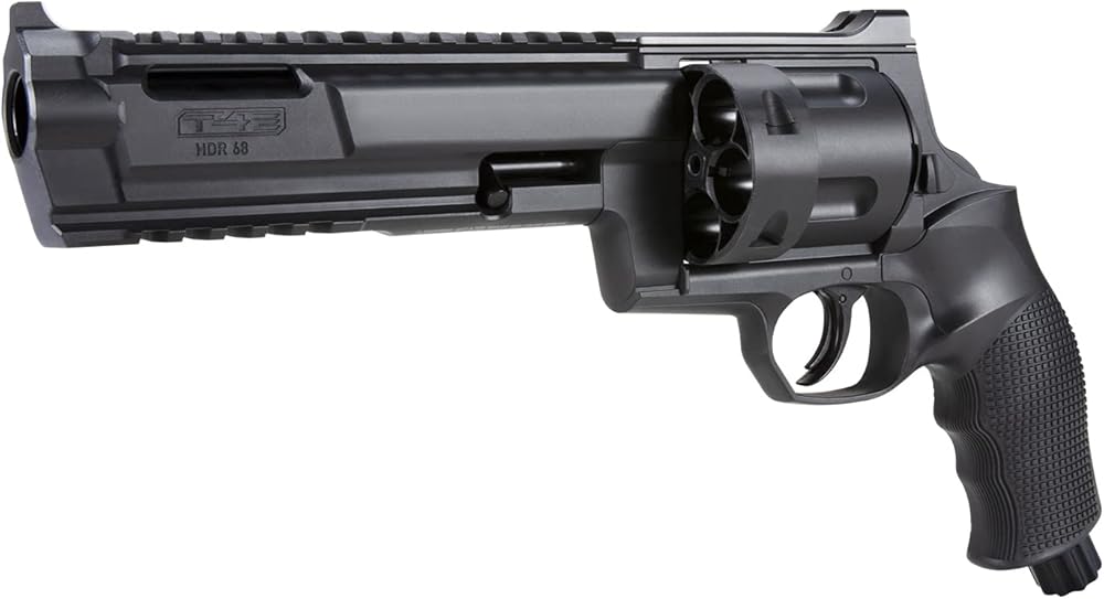 The T4E TR 68 Revolver paintball marker brings the revolver into the 21st century. This marker is powered by a single 12 gram non-threaded CO2 cartridge housed in the grip and is equipped with T4E's Quick Pierce CO2 cartridge puncturing system (CO2 NOT included). The HDR .68 Revolver holds five .68 caliber rubber, paint, or dust projectiles and launches them through the double action pull of the trigger. The three included rotary magazine disks allow for fast and easy reloading. The HDR .68 Revolver has two sections of Picatinny rail, one on the top strap that is ideal for a compact reflex sight and one below the barrel which is ideal for a laser or tactical light.