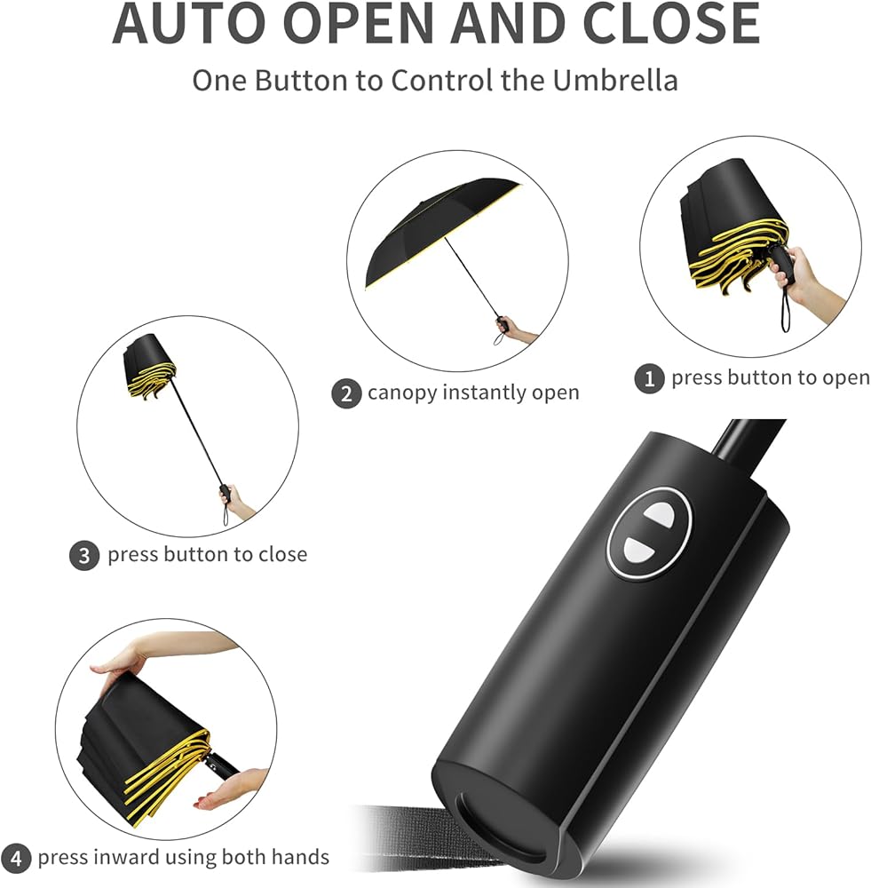 • 【مظلة مفتوحة/مغلقة تلقائيًا】تحتوي المظلات الأوتوماتيكية على نظام يسمح لك بفتحها بسرعة بضغطة زر موجودة على العمود. تعمل كفاءتها على تحسين المهام المتعددة، حيث يمكنك بسهولة فتح/إغلاق المظلة الخاصة بك للحماية الفورية من المطر أثناء التعامل مع العناصر الأخرى.