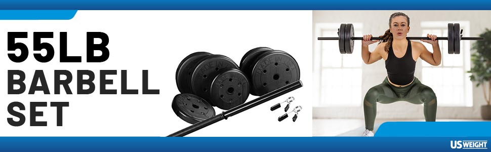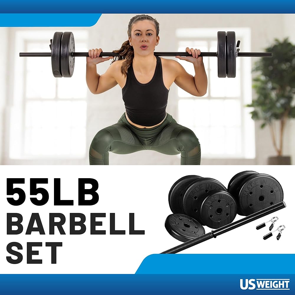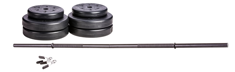 55 رطل. مجموعة أوزان الأثقال: تشتمل مجموعة الأوزان القابلة للتعديل هذه على قضيب مكون من 3 قطع بقطر 1 بوصة وطول 54 بوصة مصنوع من الفولاذ الثقيل ووزنين بوزن 5 أرطال وأربعة أوزان بوزن 10 أرطال ومشبكين زنبركيين.