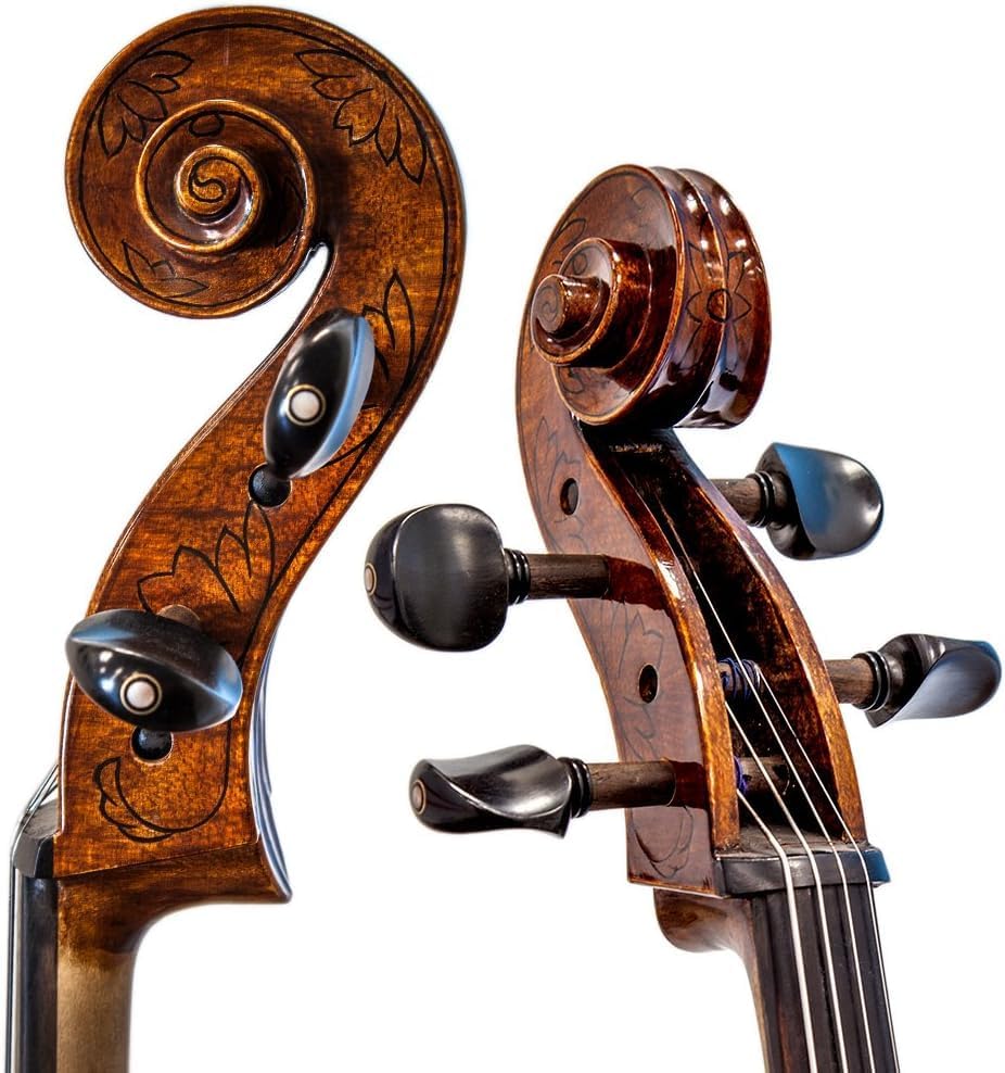This is a very beautiful SKYVA601 professional Cello outfit that comes complete with One (1) half-lined Brazil wood bow and luxurious euro-style Cello fiber glass case with wheels. This Cello is professionally set up in California and ready to play, hand carved with oil varnished finish, 100% hand-carved spruce top and 100% hand-carved with highly flamed maple back, sides, neck and scroll. This Cello has beautiful inlaid purfling, and pegs, fingerboard and chinrest are made from ebony wood. Tailpiece is made from ebony wood with one (1) high quality built in fine tuner. High quality Austrian rosin cake is included. Cello case Features two bow holders, large zippered pocket on the back exterior for sheet music & accessories. Quality material used throughout the case with red exterior and elegant red velvet interior. Bow is octagonal with double pearl eye and very well balanced, Real unbleached Mongolian horsehair. It also comes with a new fitted bridge and intermediate German made high quality strings. This Cello has rich powerful and deep sound, excellent projection and great sensations while playing. Beautiful warm resonant tone, with clear harmonics. Well balanced on all strings. This Cello can be played aggressively without feeling sluggish, or softly for a sweet mellow tone.